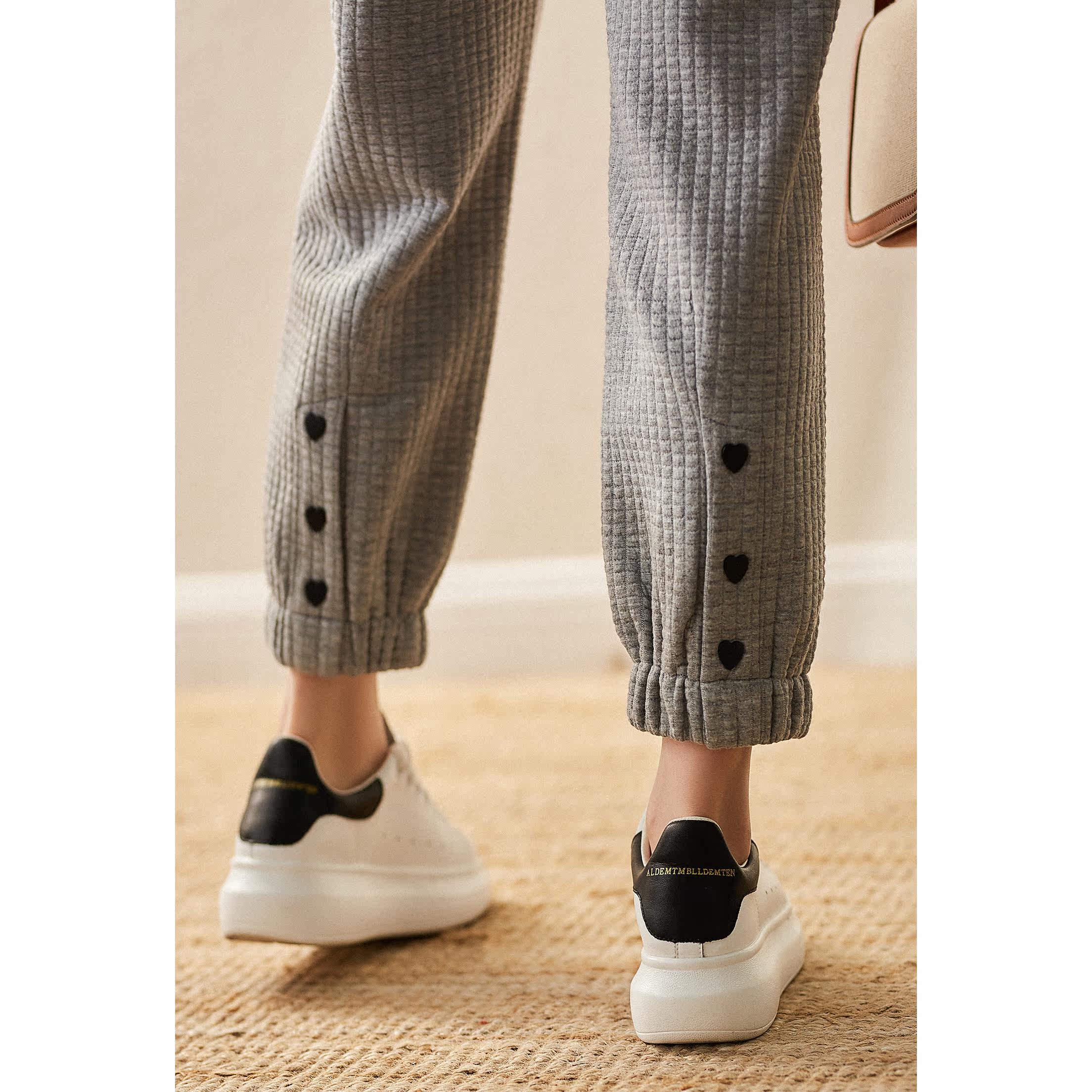 The female pants are high in the waist.: