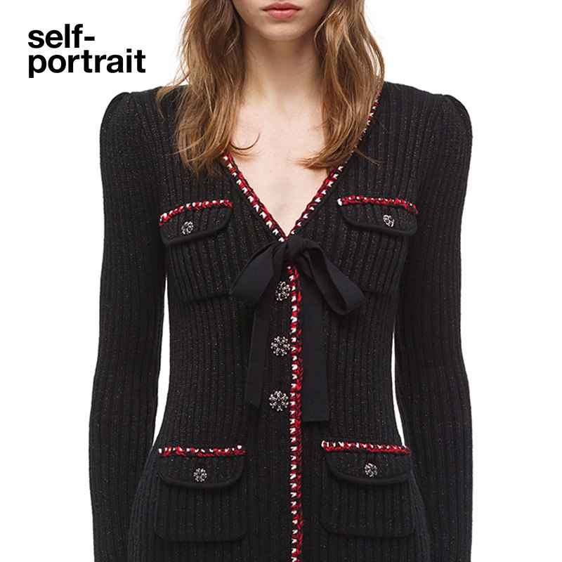 self-portrait autumn and winter classic black bow V-neck knitted sweater dress skirt