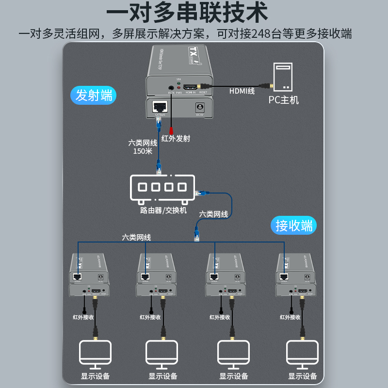 Engineering-grade HDMI extender 150m network cable to high-definition transmitter 60m RJ45 LAN IP switch one-to-many network transceiver audio and video synchronization amplifier 1080P infrared