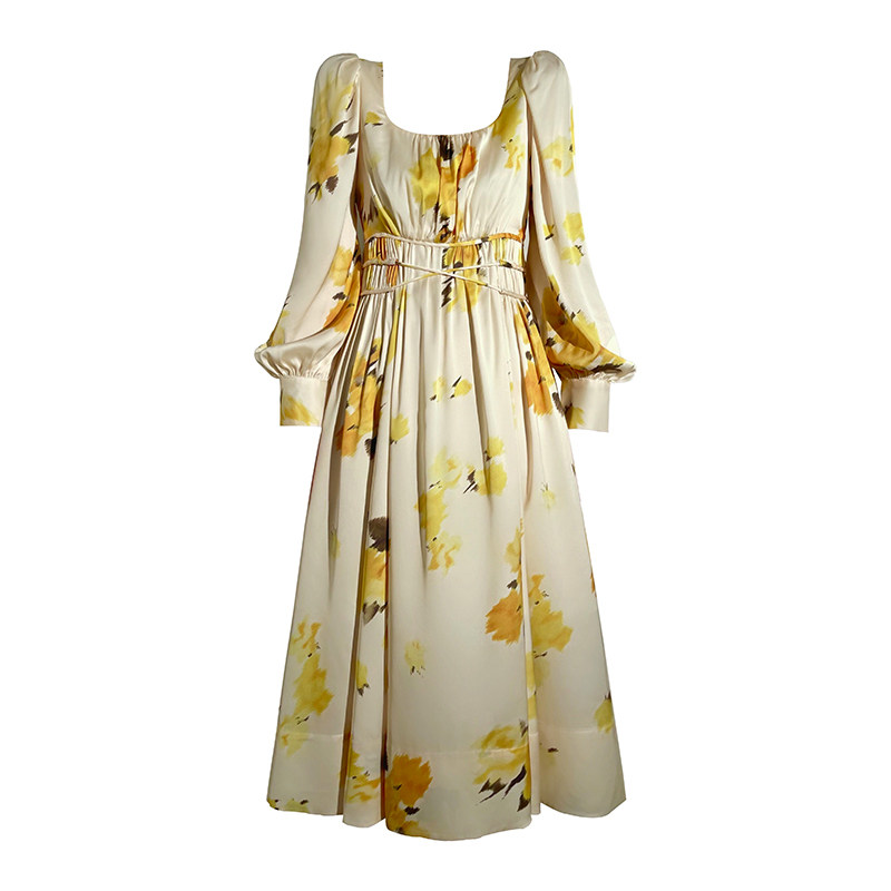 Aconiconi | French elegant romantic niche print dress Autumn New retro square collar holiday Medium-length dress