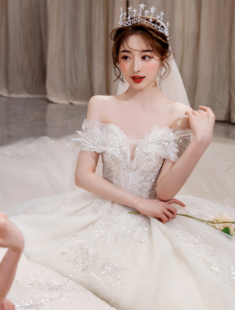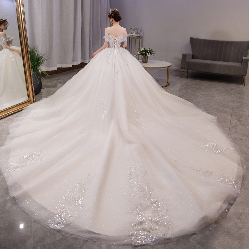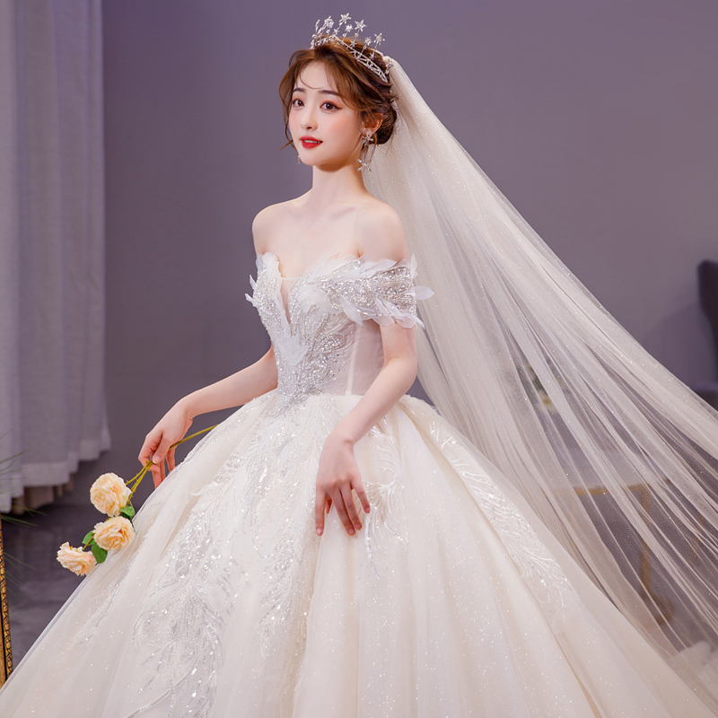 Straight Shoulder Main Wedding Dress 2021 New Temperament Bridal Style Light Retro Lavish Palace With Great Tug Trailing