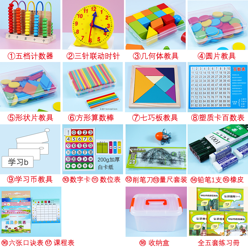 First grade 5 sets of workbooks, 9 sets of fine math teaching aids, 9 sets of math teaching aids, 5 sets of workbooks, fine math teaching aids, 18 sets of math teaching aids, 18 sets of work books