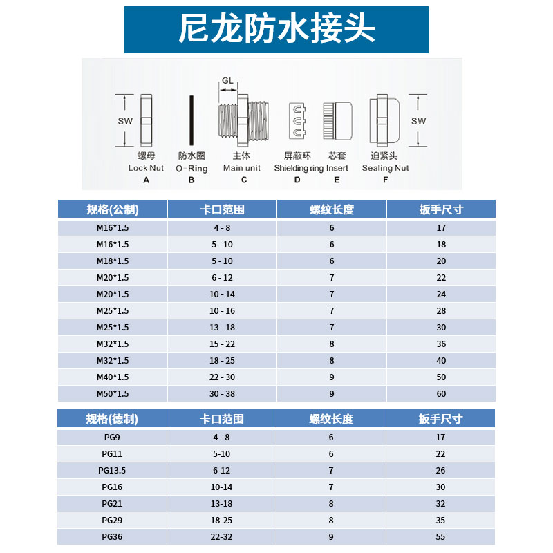 JG nylon plastic wire and cable waterproof connector PG7 9 11 13 5 1620 sealed and fixed Ge Gelan head