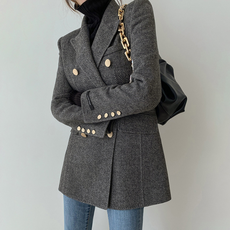 Grey Autumn winter wool Sumpsuit jacket jacket Women's laminated cotton thickened retro herringbone veins Long version of cashmere Western-style clothes