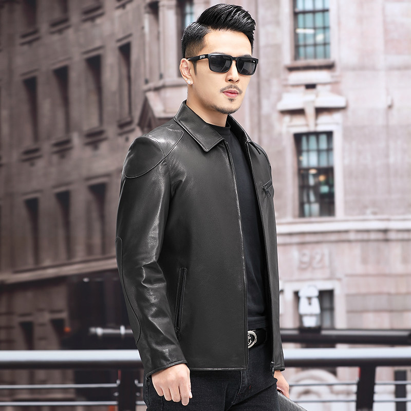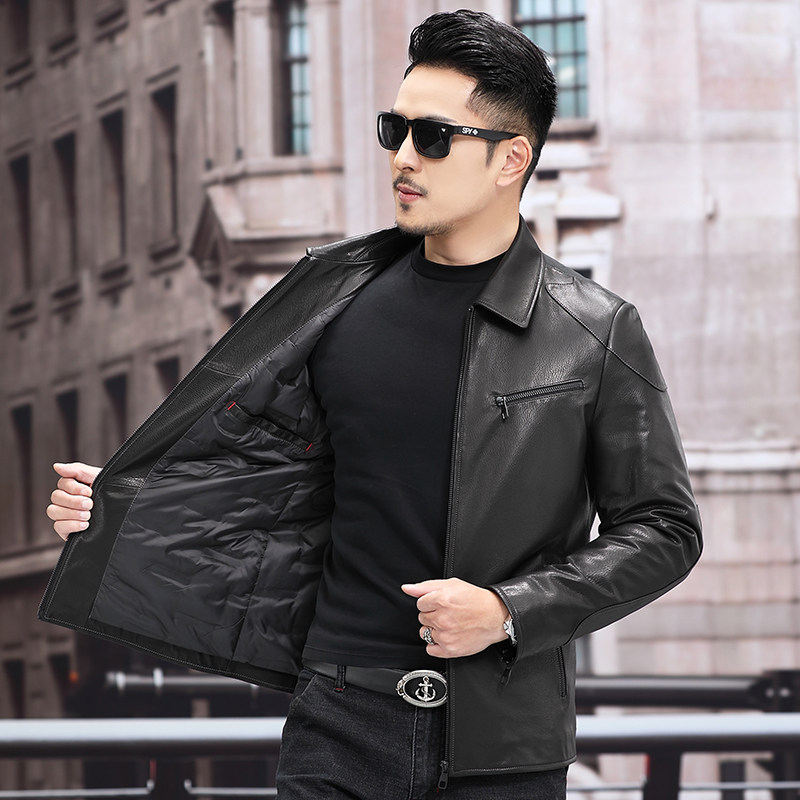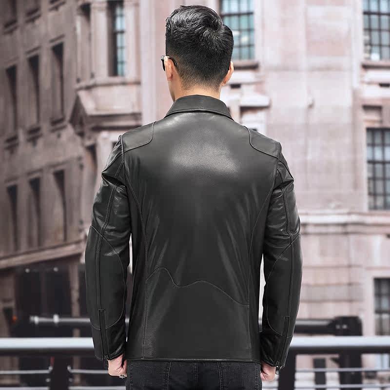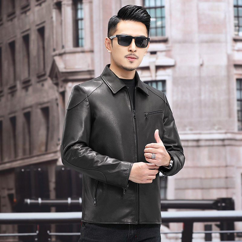 Leather leather jacket men's short lapel goatskin jacket slim spring and autumn new velvet motorcycle jacket
