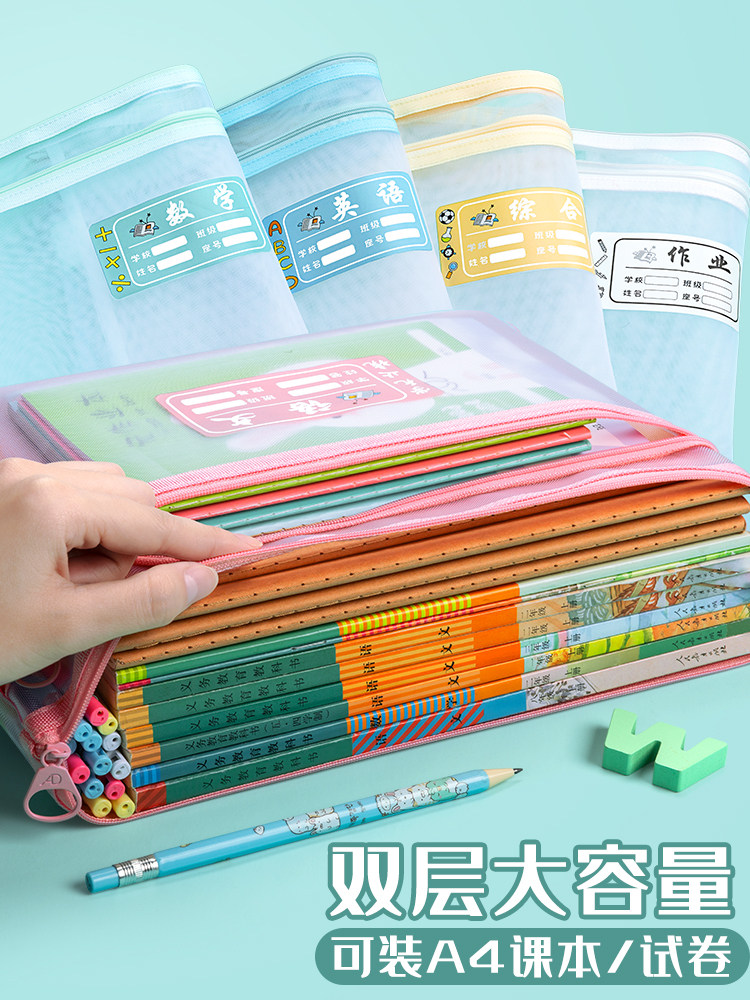 Subject classification file bag zipper double-layer large-capacity primary school student homework bag student with test paper storage bag information bag a4 Chinese mathematics and English subject book bag transparent paper bag