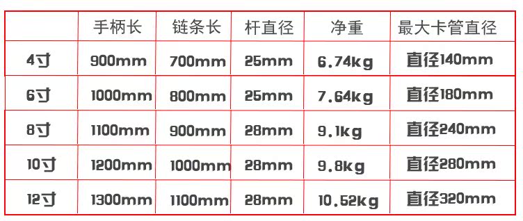 Chain Pipe Wrench 4 Inch (900mm) Chain Pipe Wrench 6 Inch (1000mm) Chain Pipe Wrench 8 Inch (1100mm) Chain Pipe Wrench 10 Inch (1200mm) Chain Pipe Wrench