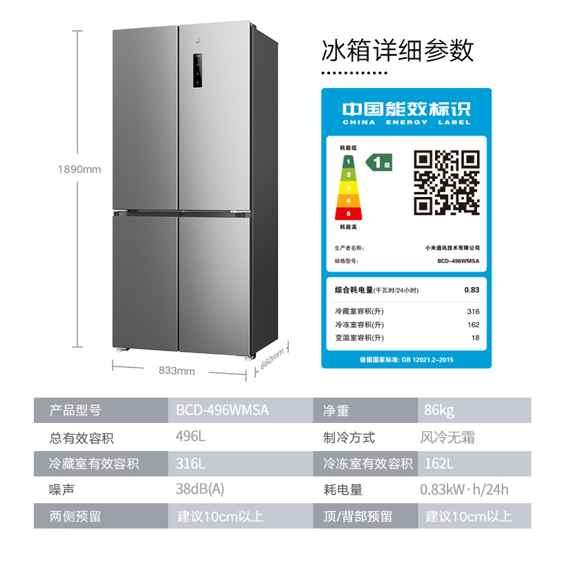 Xiaomi Mi Home 496-liter cross to open door household refrigerator four-door air-cooled frost-free frequency conversion class energy saving