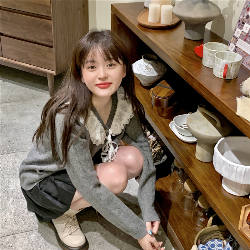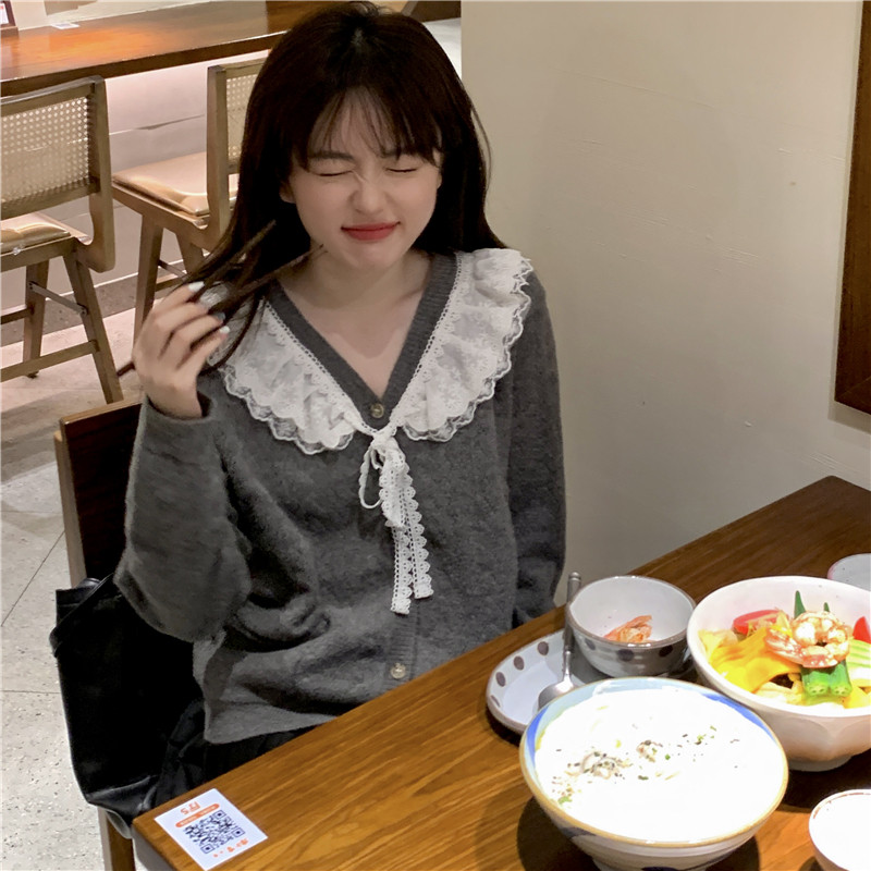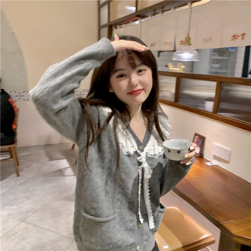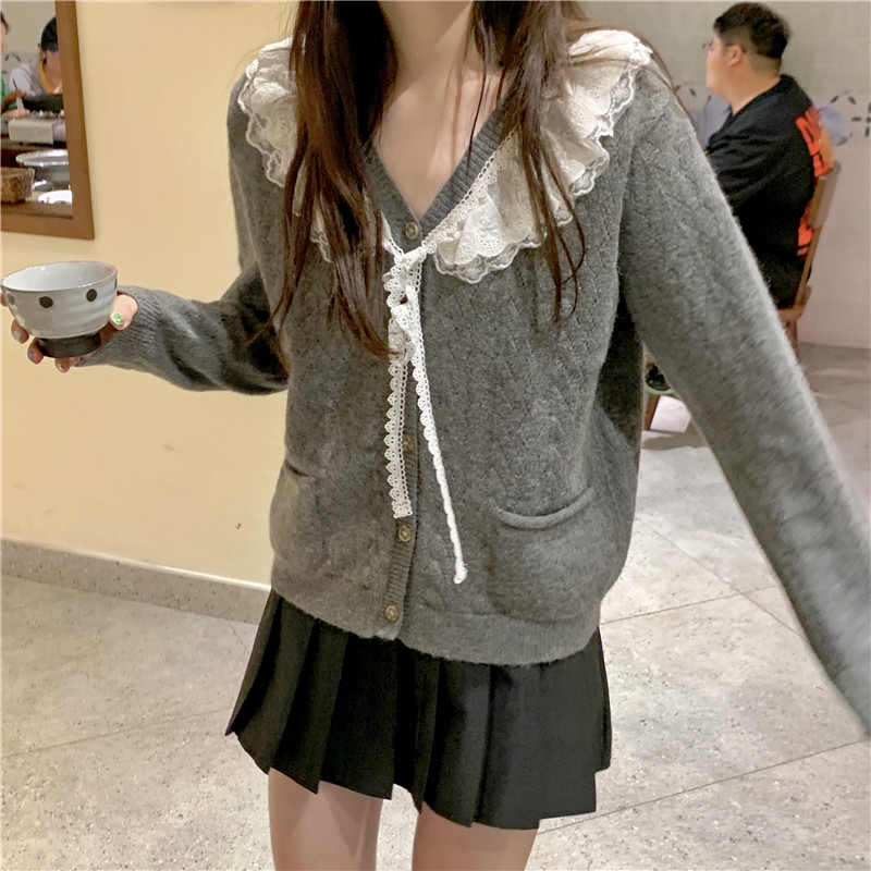 Doll Collar Sweater Women Early Spring Cute Sweet Beauty Lace Side V Collar Knit Cardiovert Coat Japan Gentle Blouse