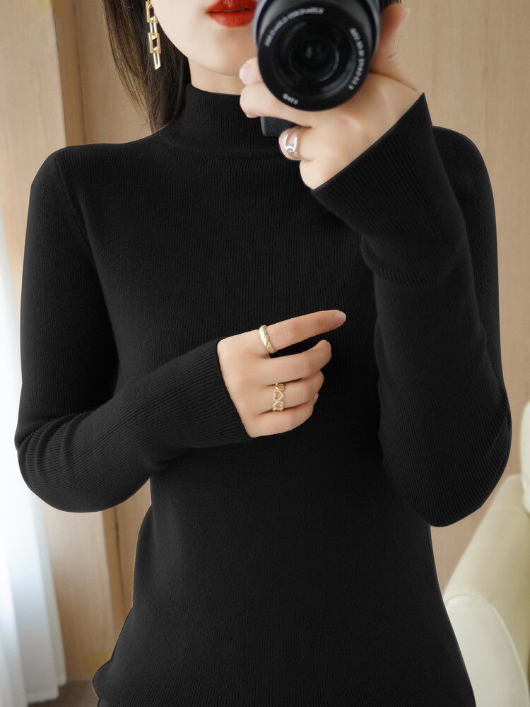 Half-high collar with long-sleeved knitted top for women's autumn and winter new fashion slim pullover bottoming shirt solid color sweater