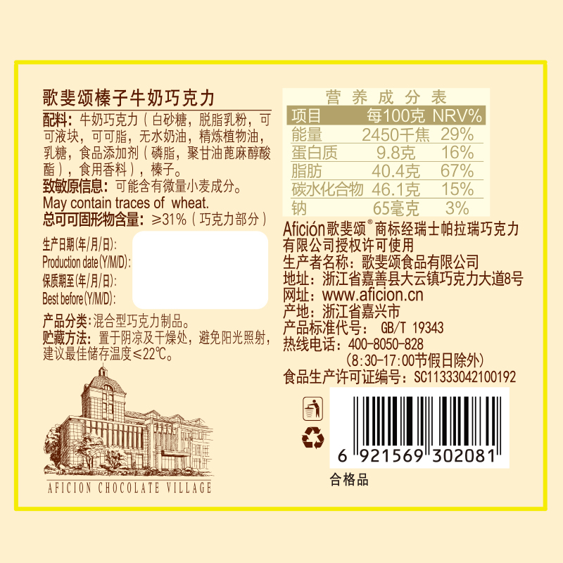 Milk chocolate (white sugar cocoa liquid block skim milk powder cocoa butter refined vegetable oil milk fat lactose whey powder cocoa powder food additive (soy phospholipid polyglycerol ricin)