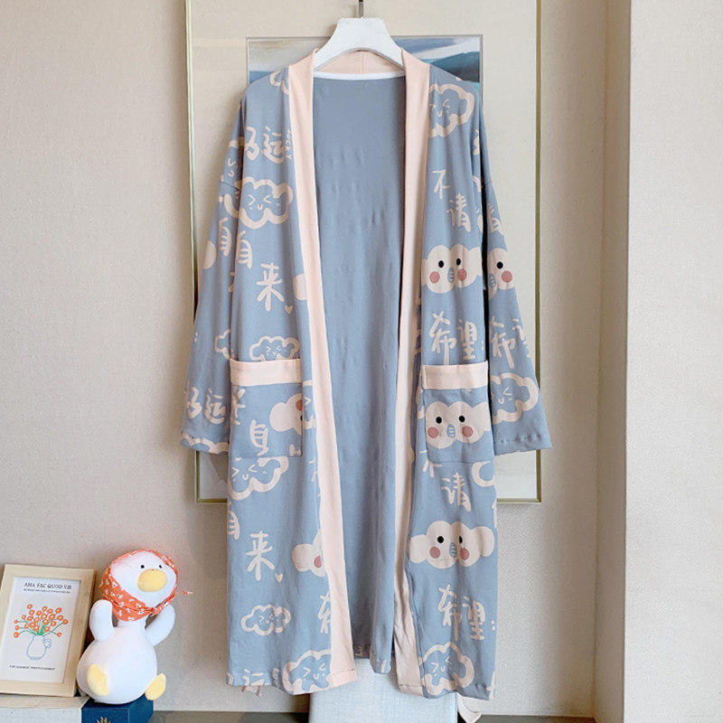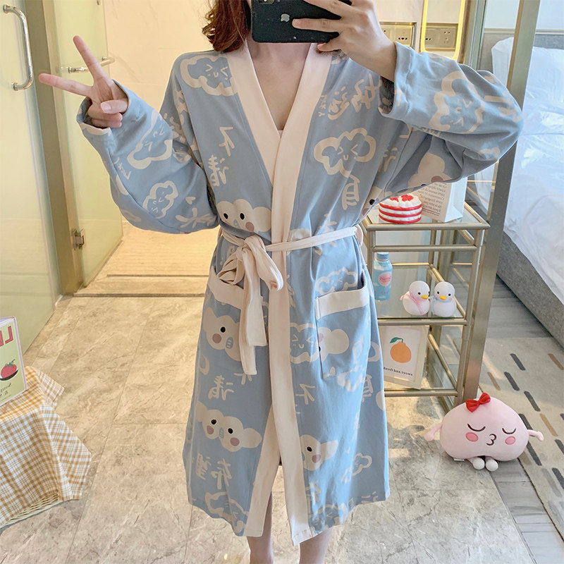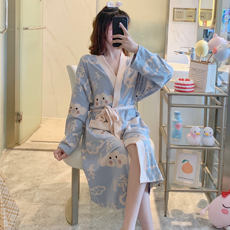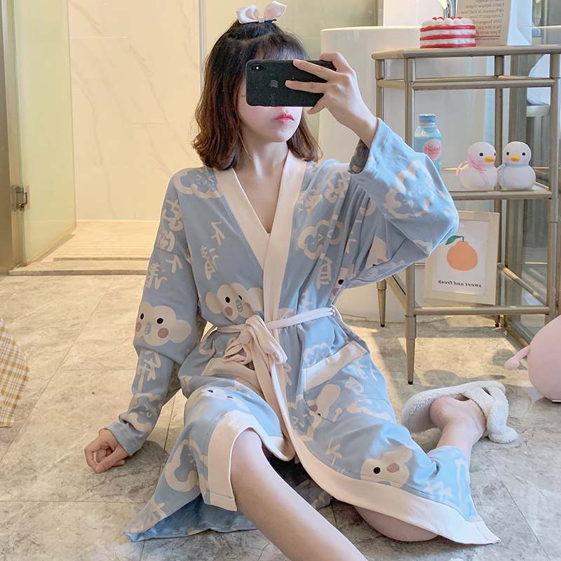 Aging College Wind ~ Little Fresh Sleeping Pajamas Pyjamas Women's Spring Autumn Season Pure Cotton Long Sleeves Cute Light Blue Home Ju Clothes