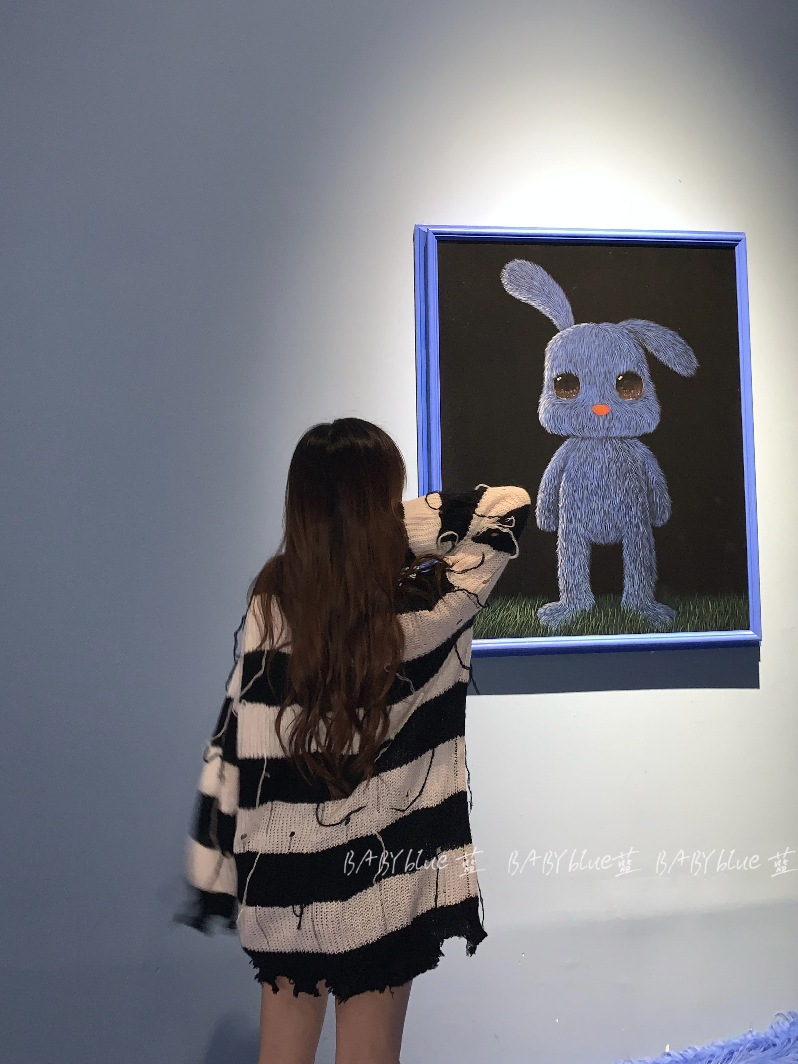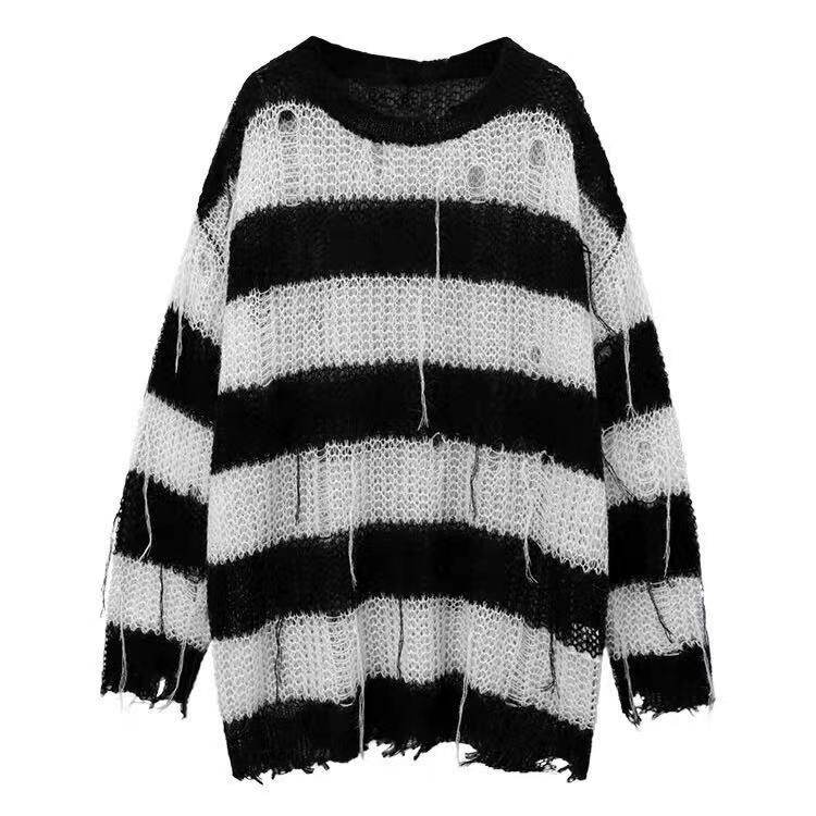 BABYblue (high street hole) striped fringed hole hollow knitted sweater women's sweater loose design