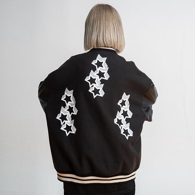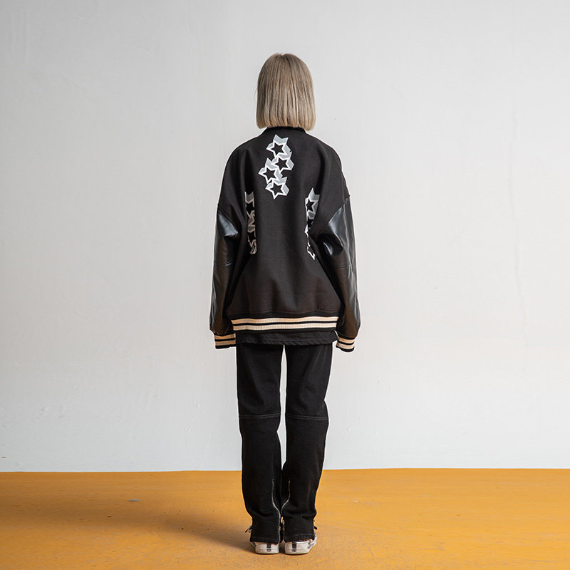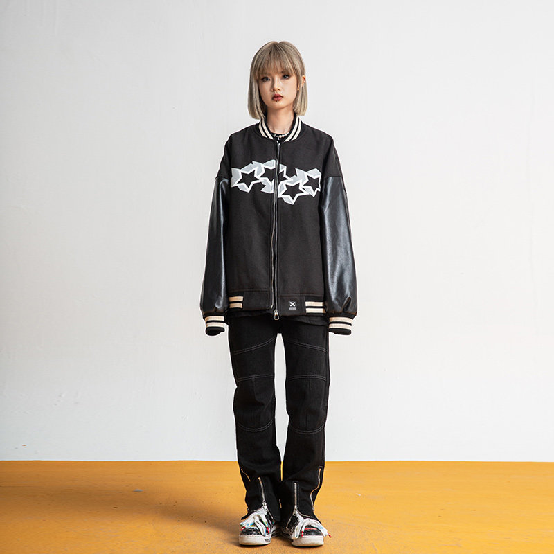 New Factor New Small Stars Printed Cuffs PU Leather Baseball Uniform Loose Casual Jacket Jacket Man Spring Autumn
