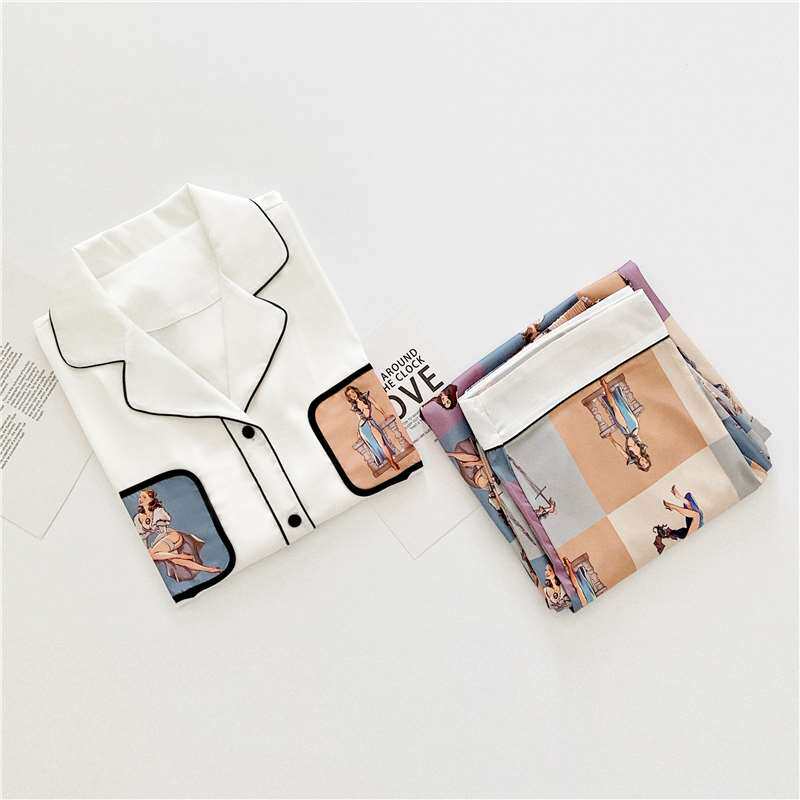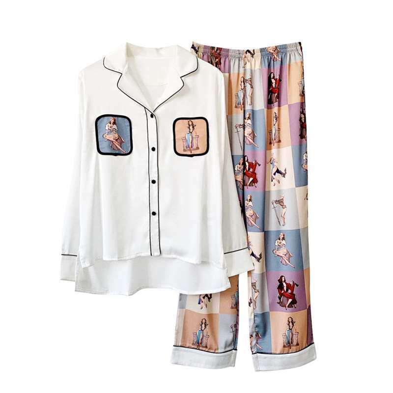 Mulberry silk pajamas female ins spring and autumn sexy thin section printed silk long-sleeved trousers loose home service suit