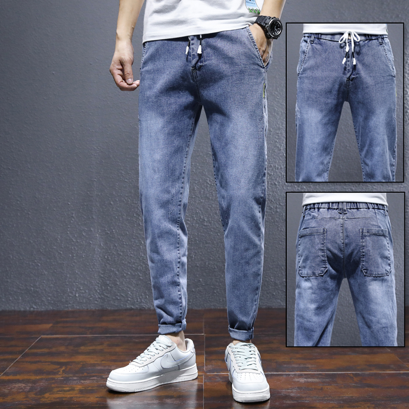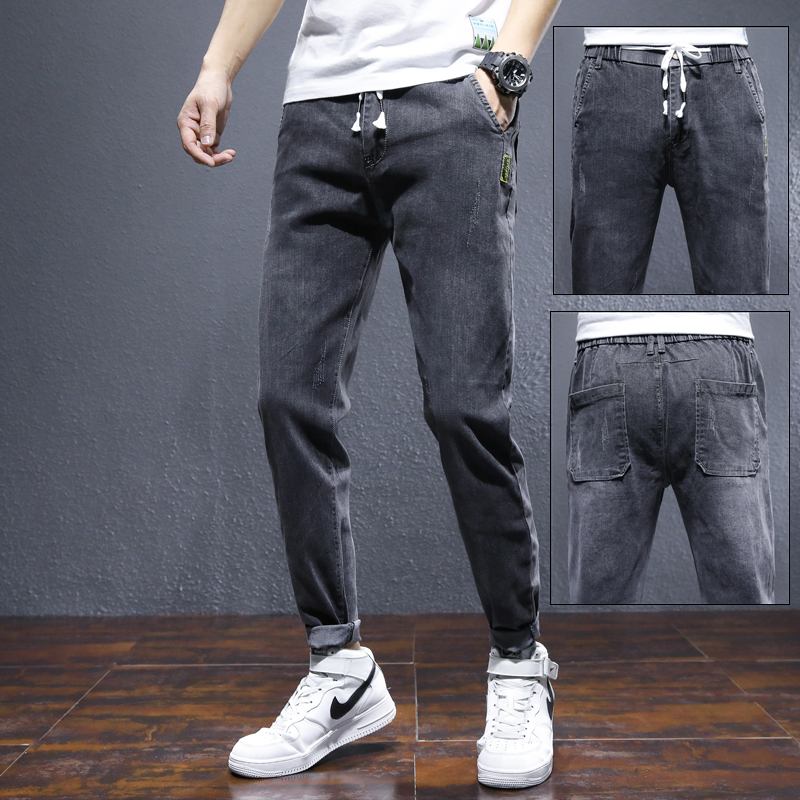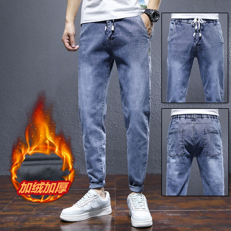 Autumn Winter Men's Elastic Jeans Tightness Waist Plus Suede Thickened Body Smoke Pipe Pants Trendy Casual Strap Long Pants