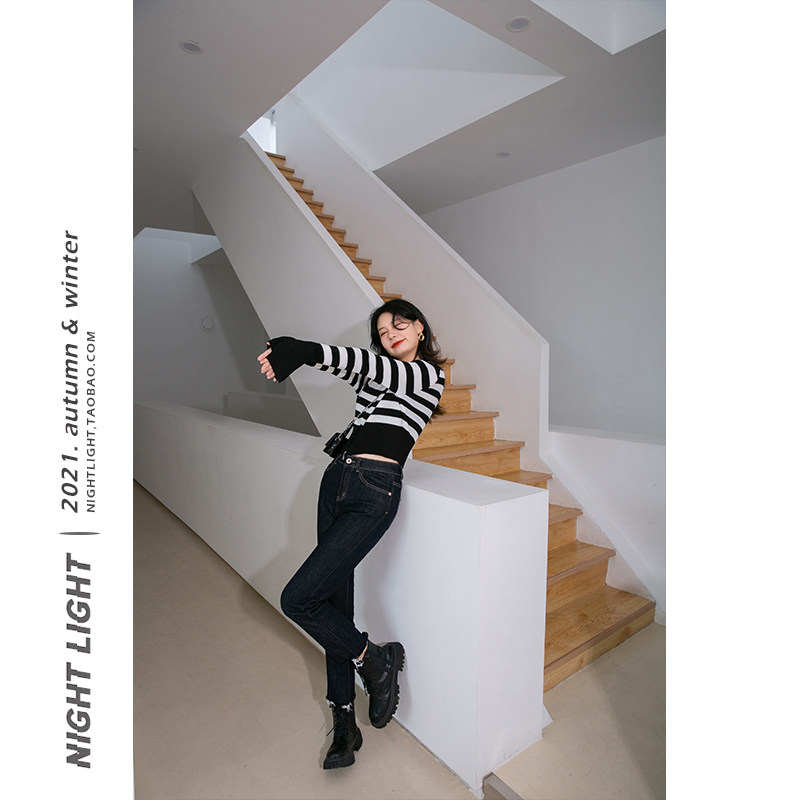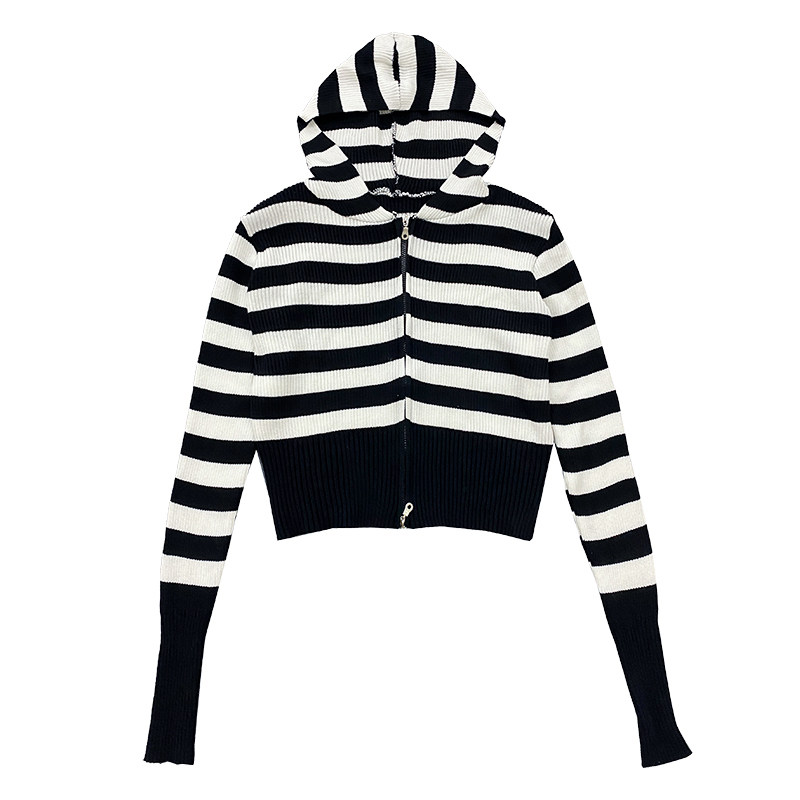 Luminous ins net red striped short-and-hat-knitted sweatshirt woman 2022 fall new sexy slideshow long sleeve blouse