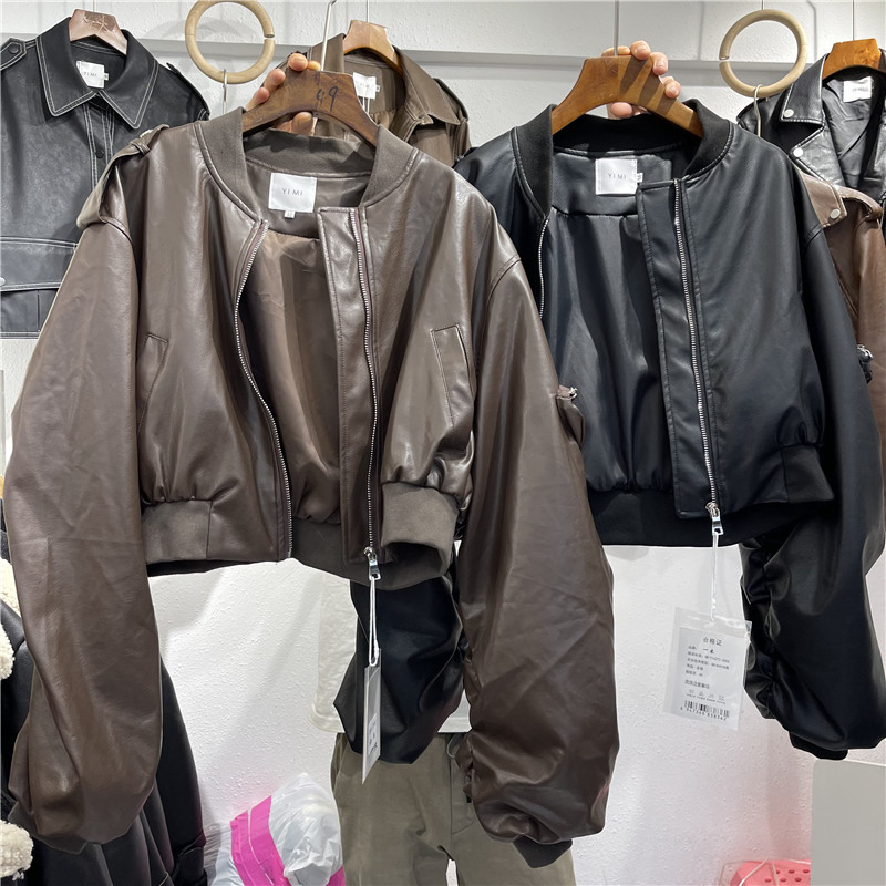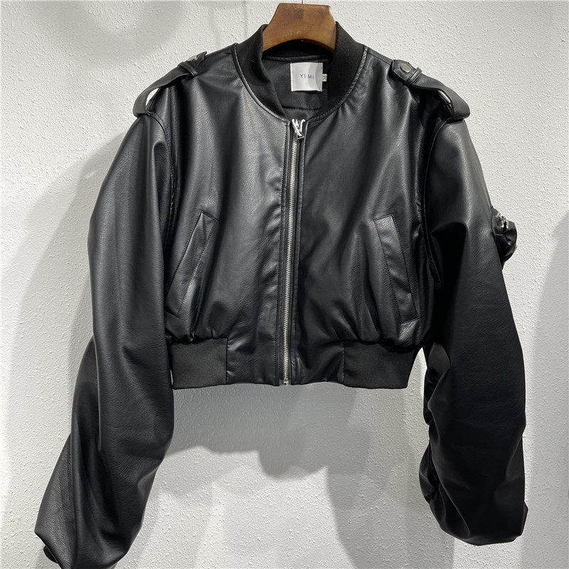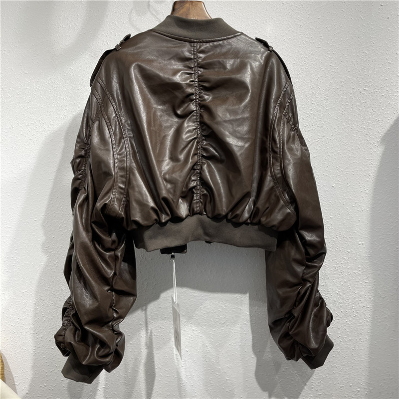 Handsome short Locomotive Leather Jacket Tide-Style Fried Street Fashion Bat Folds Sleeves 2021 Autumn New Fur Coats Woman