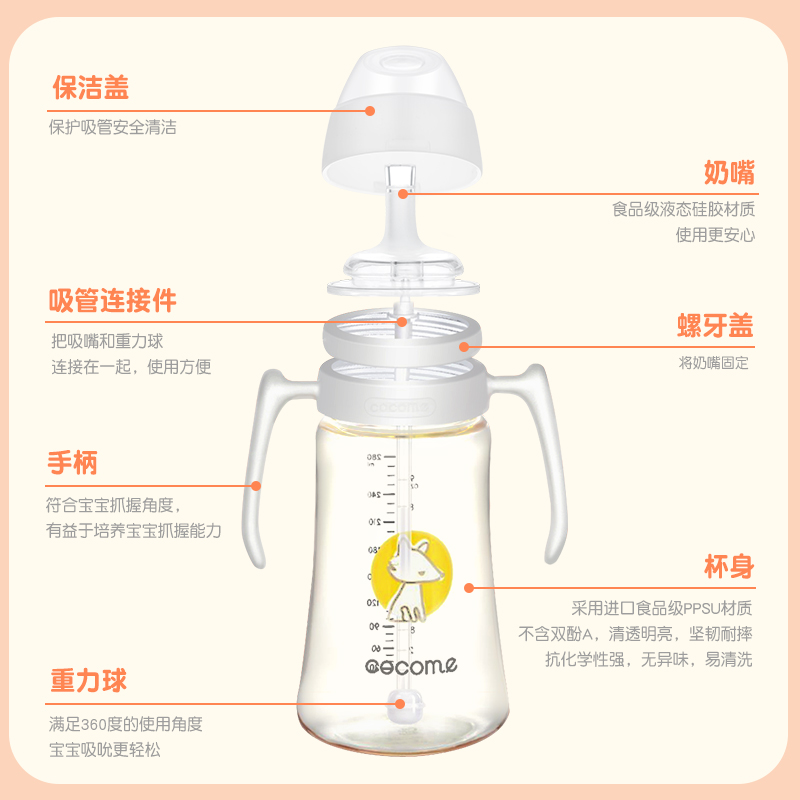 Cocoa cute baby boy ppsu straw bottle 1 year old drinking milk drinking cup straw water cup 1 set of anti-choking water