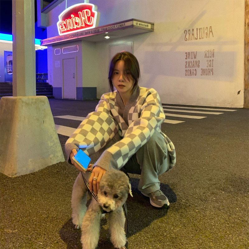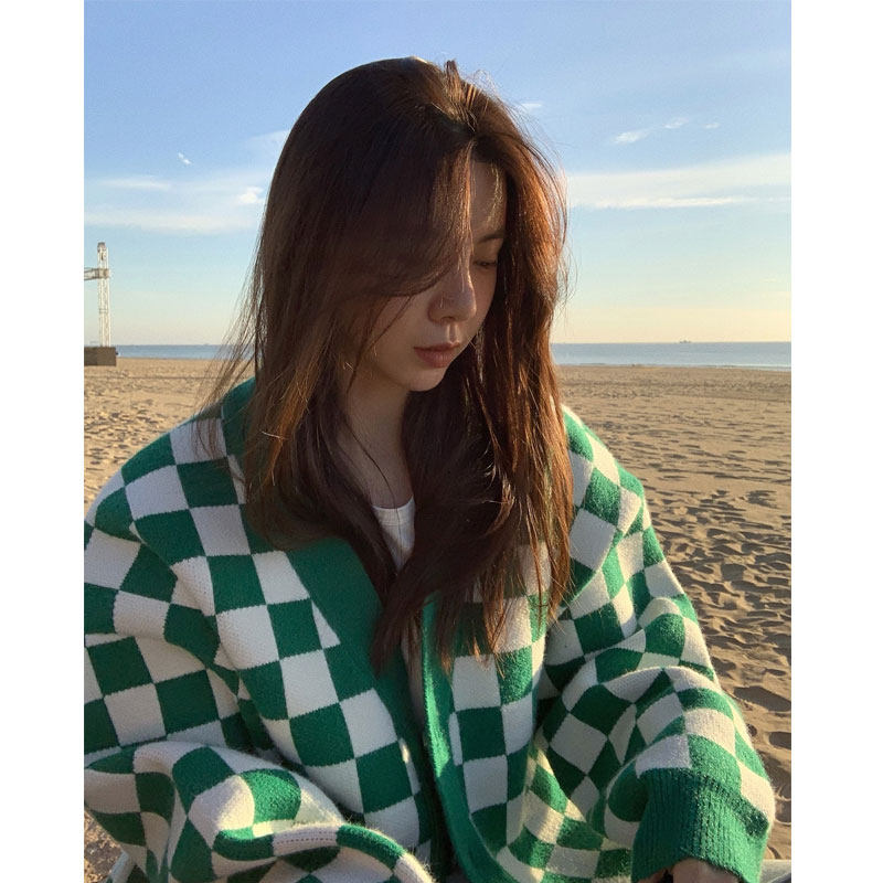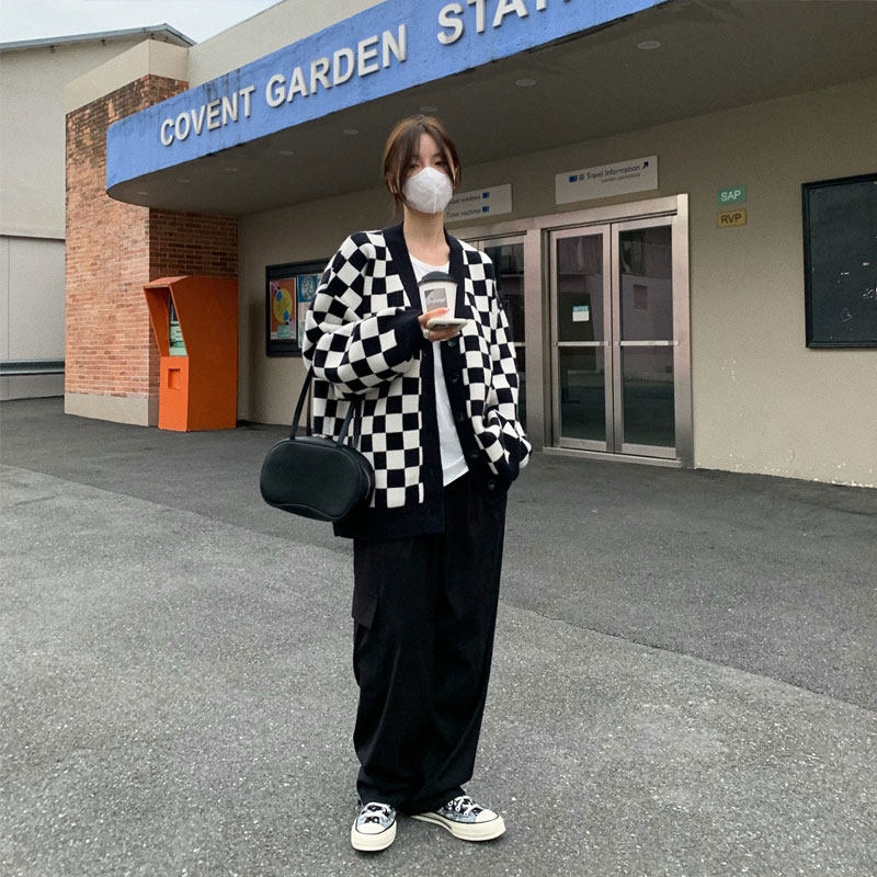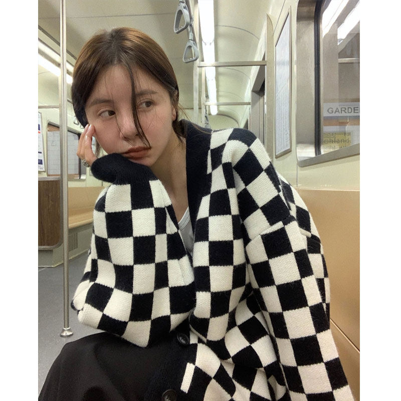Retro lazy style checkerboard plaid sweater women 2022 autumn and winter new Korean version loose V-neck knitted cardigan jacket