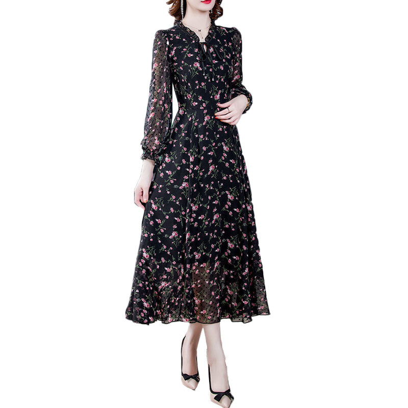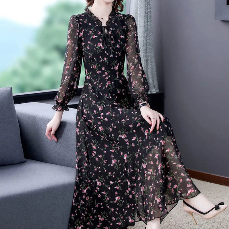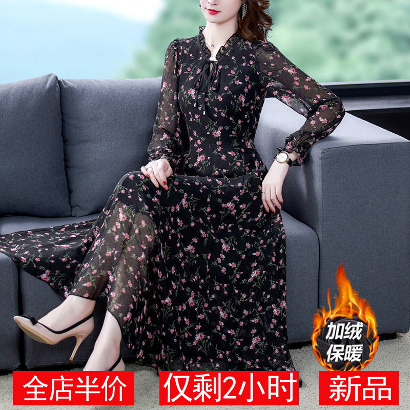 2022 spring and autumn clothing large size women's floral chiffon dress long sleeves plus velvet fat MM age-reducing and thin bottoming skirt