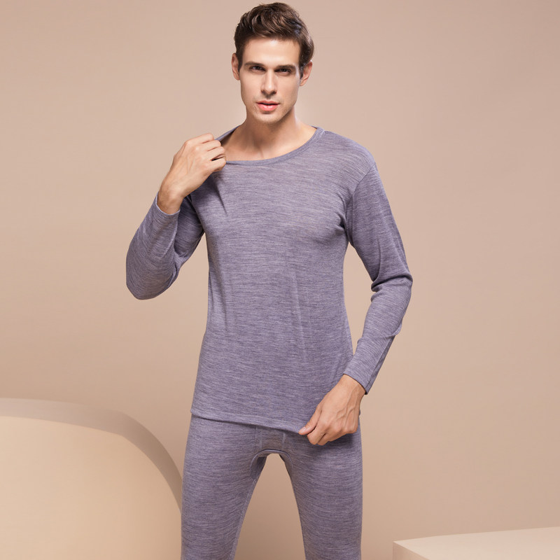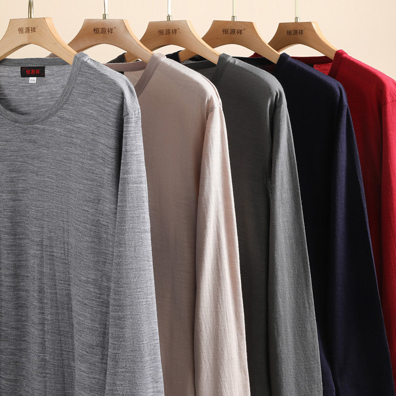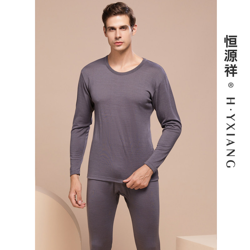 Hengyuanxiang pure wool underwear men's autumn and winter solid color round neck thin warm 100% wool long johns suit