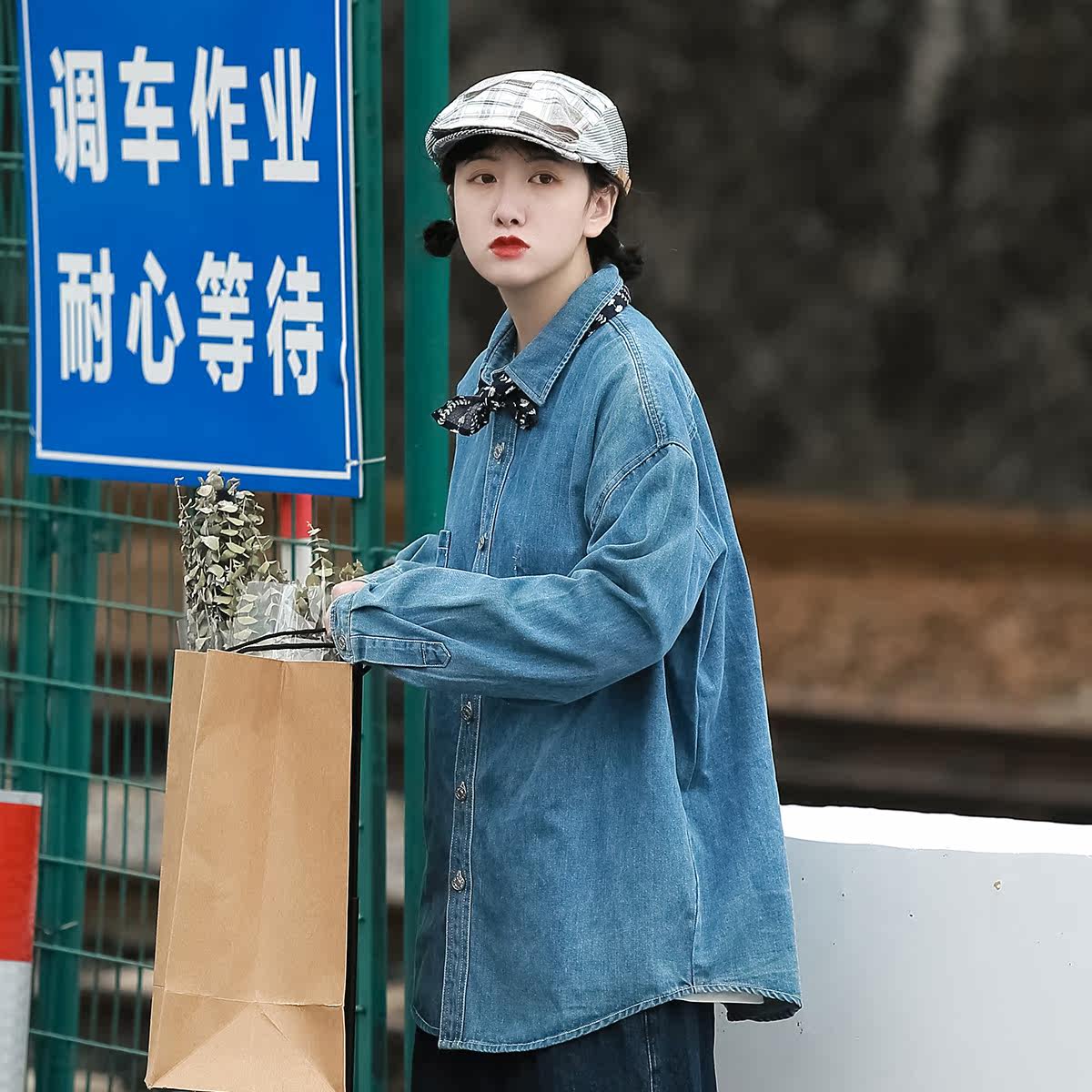Spring and Autumn Washed Old Denim Shirt Women's Japanese Retro Casual Loose Outerwear Shirt Tooling Pocket Jacket Tide