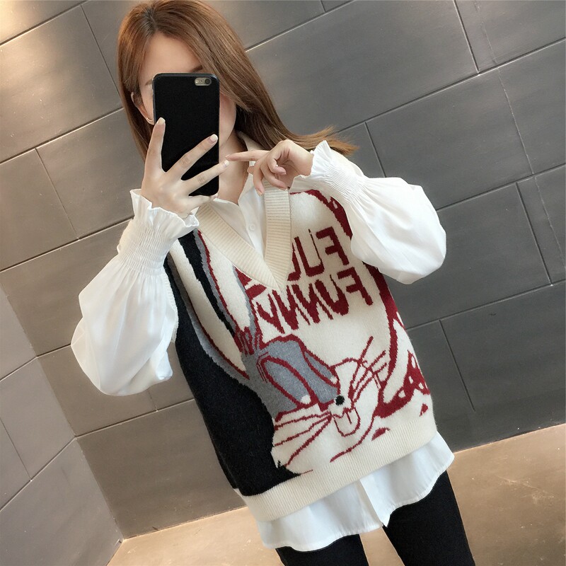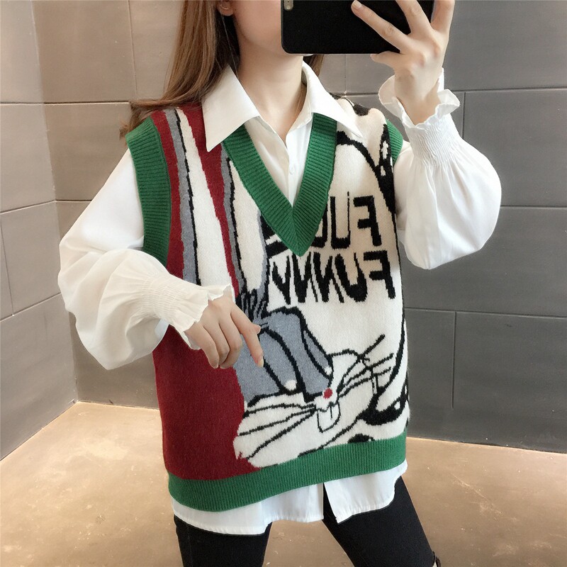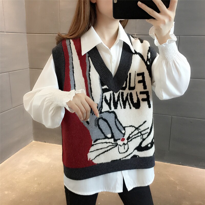 Waistcoat Vest Knit 2021 New Fall Ladies Aging Woolen Sweater Horse Clip Trendy Fashion V Collar Loose