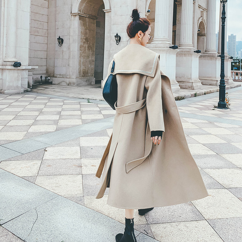 Camel woolen coat women's mid-length version over the knee 2021 autumn and winter new high-end niche navy collar woolen coat