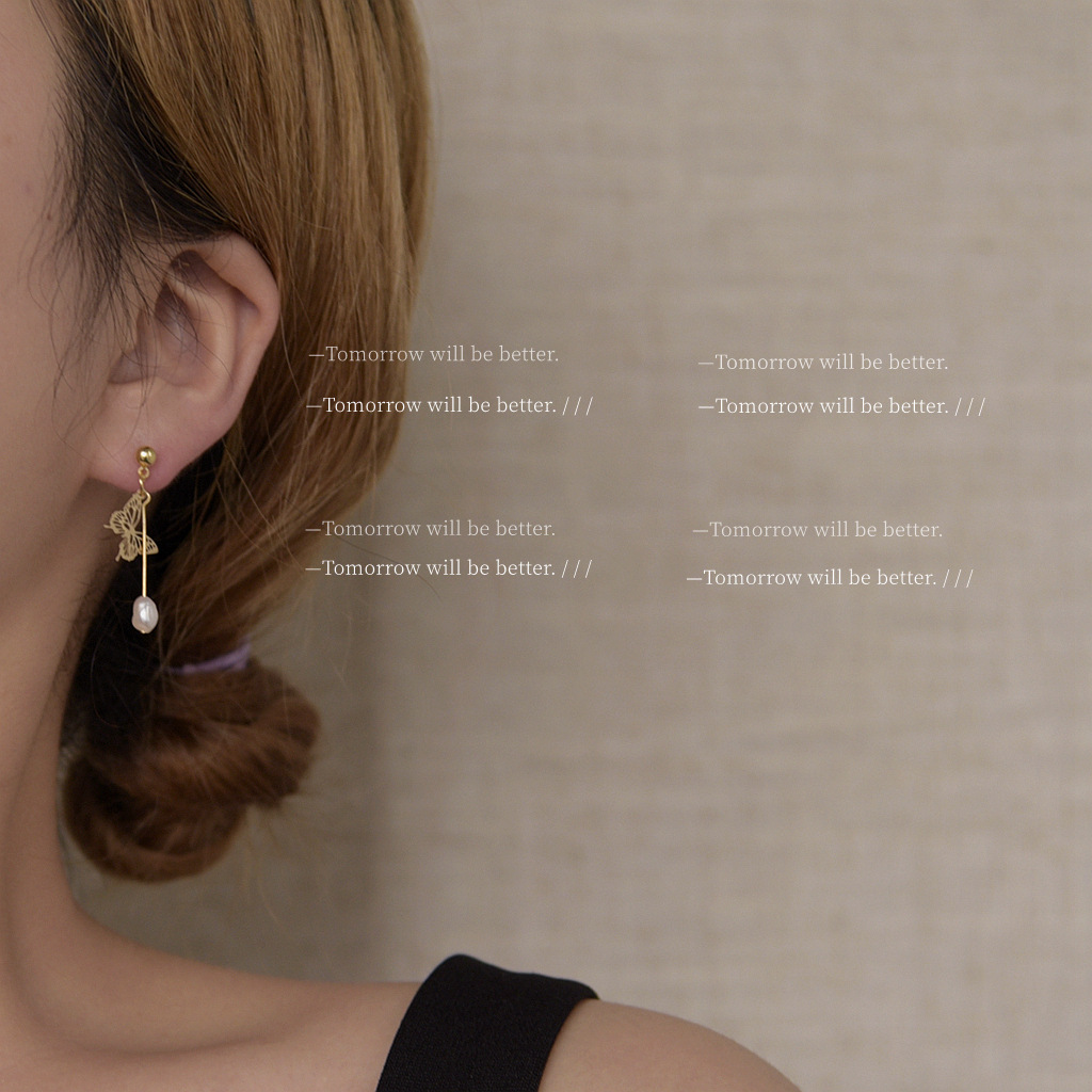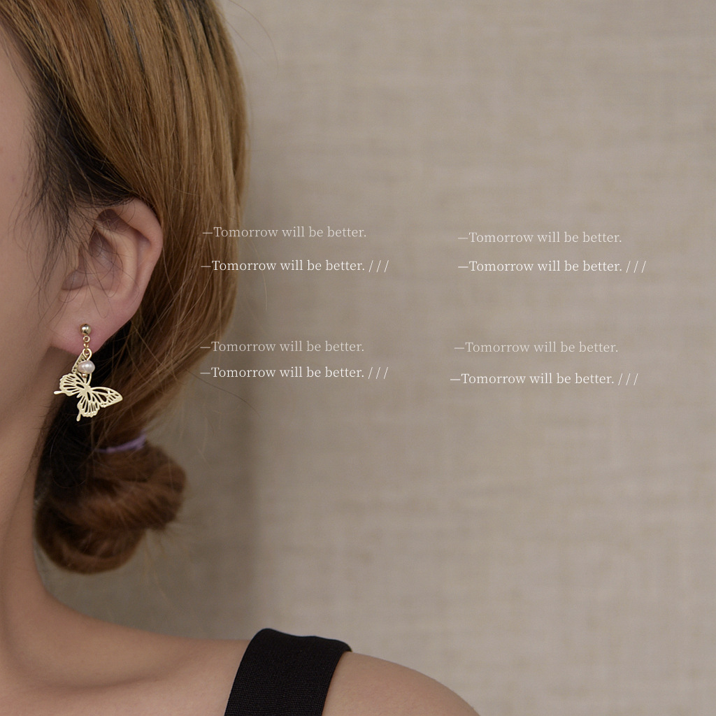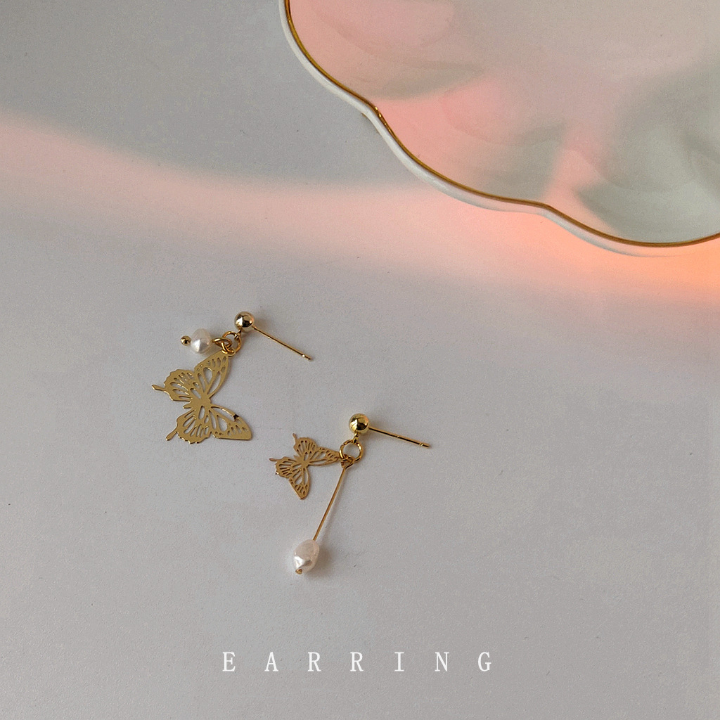 GANMOGU asymmetric freshwater pearl hollow butterfly silver needle earrings female hand-made fairy design earrings Korea