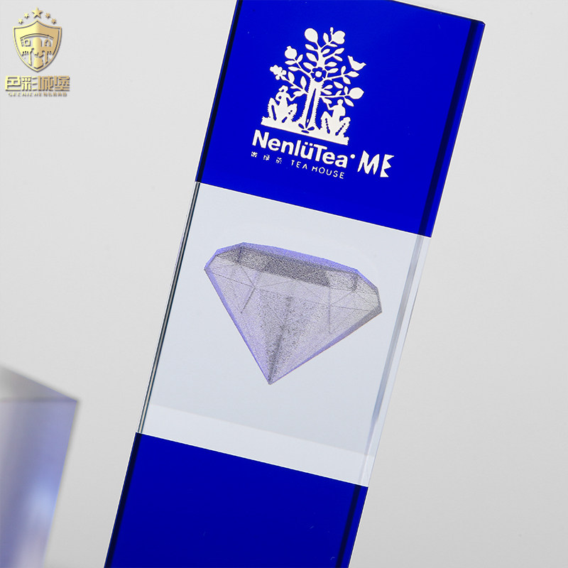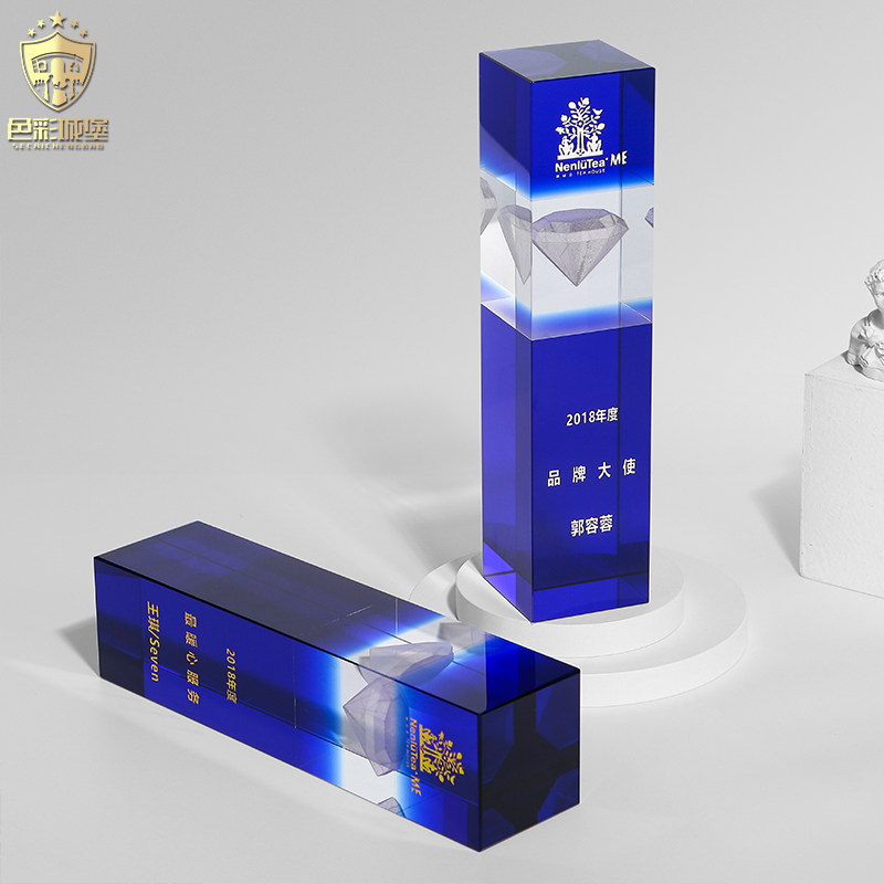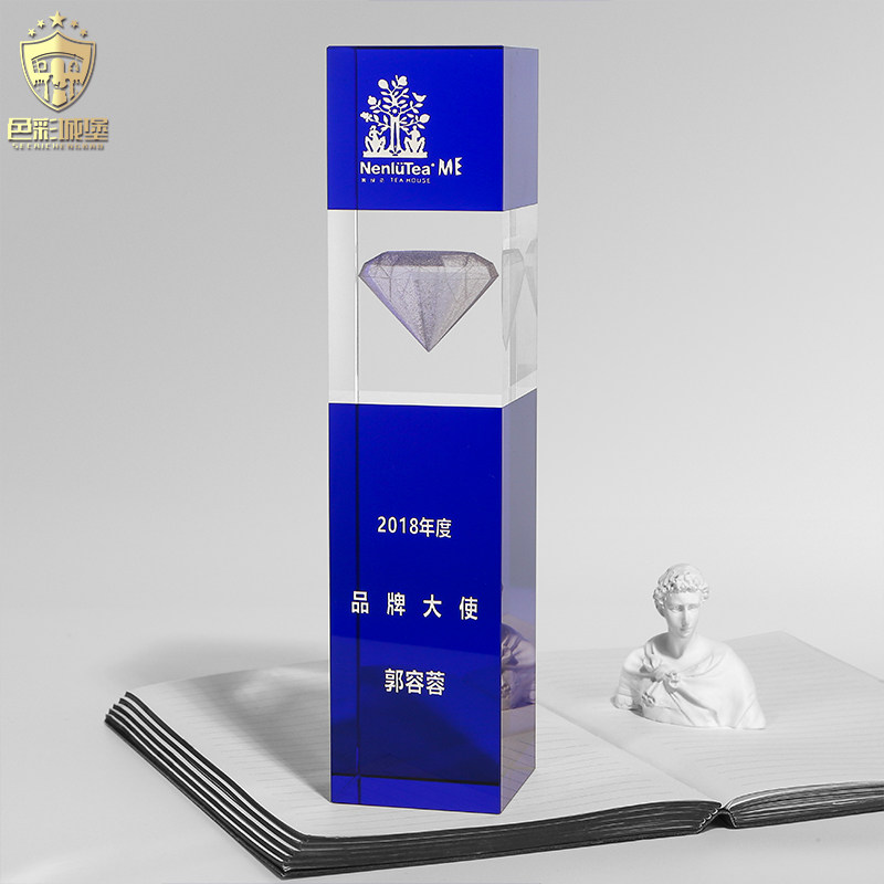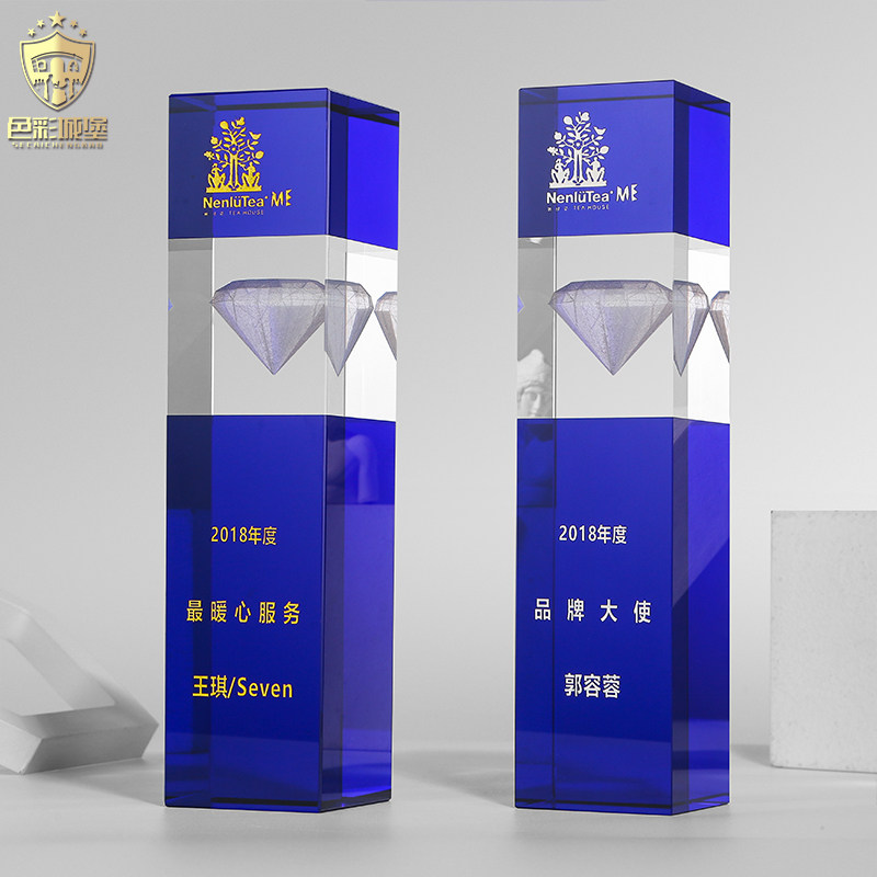 Creative blue crystal trophy custom high-end crystal medals for outstanding employees custom lettering making inner carved diamonds