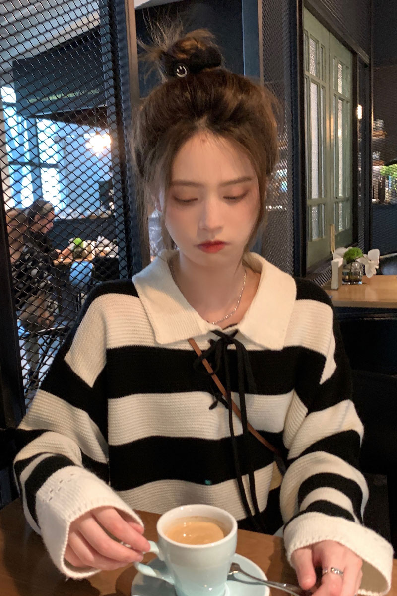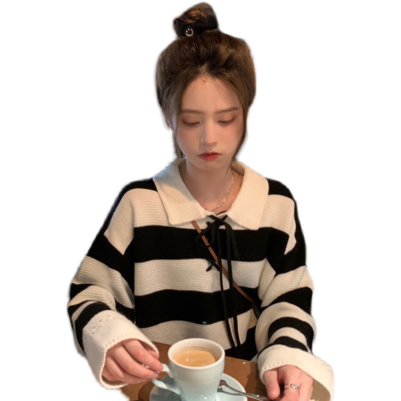 Early autumn striped sweater women's 2021 autumn new retro POLO collar sweater design lazy sweater top