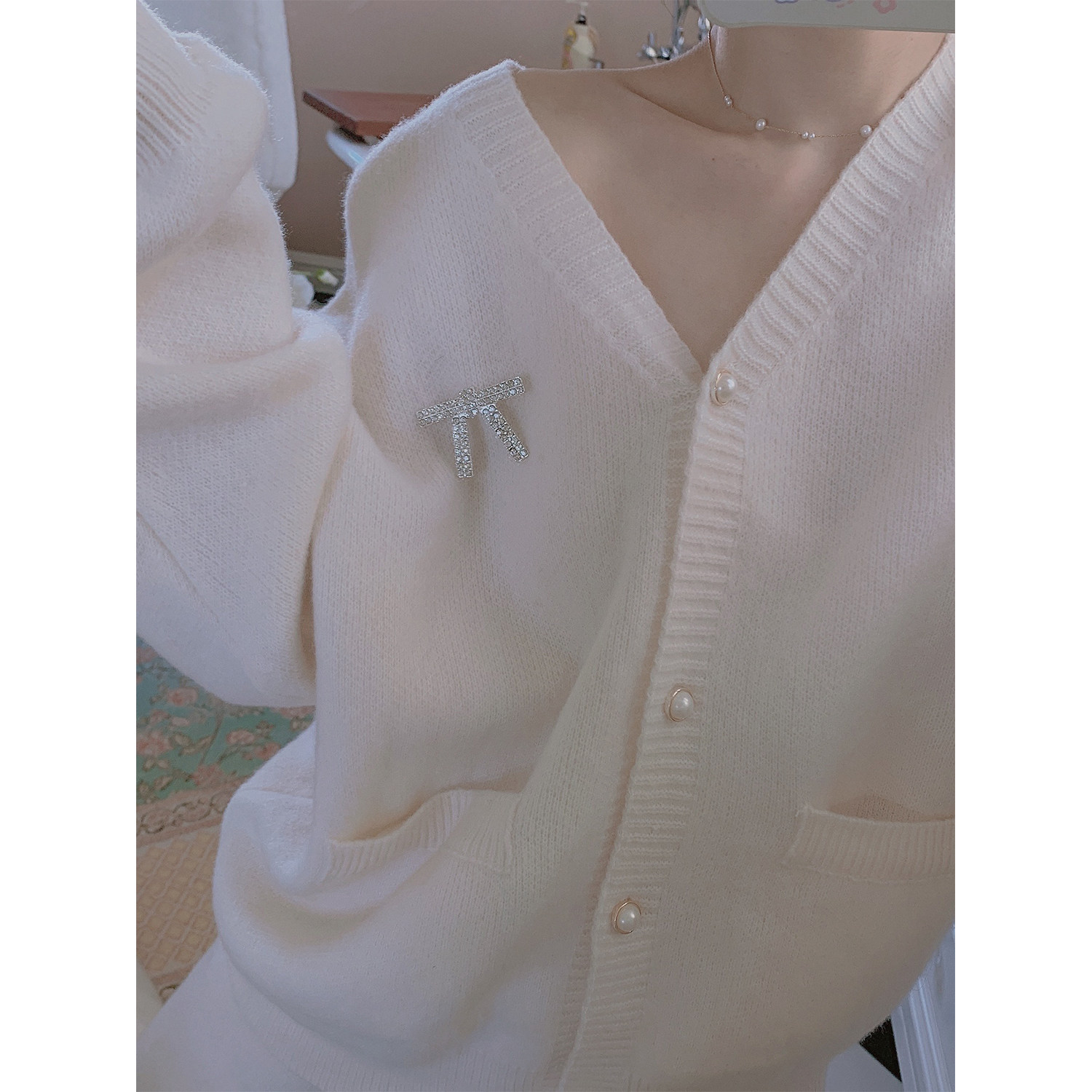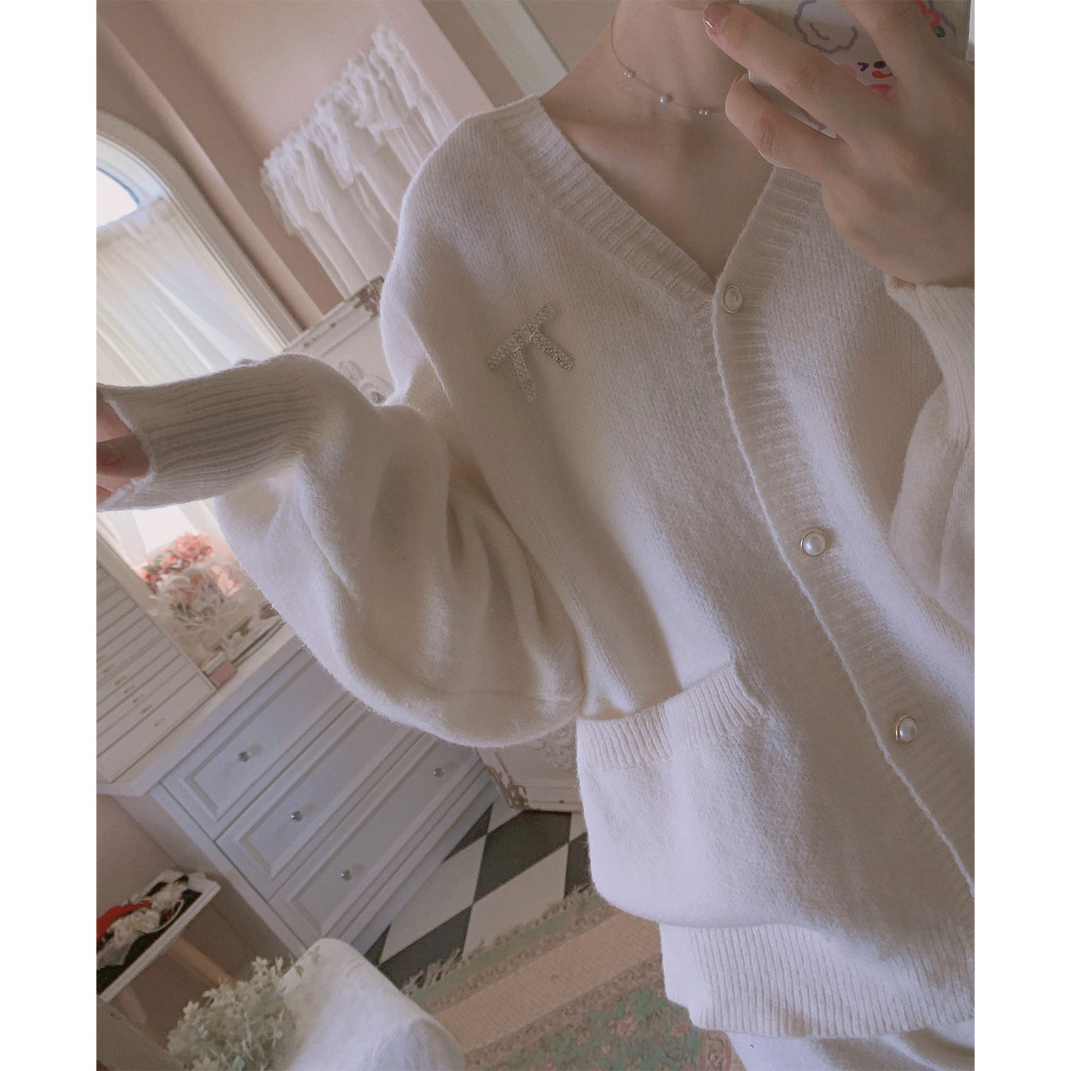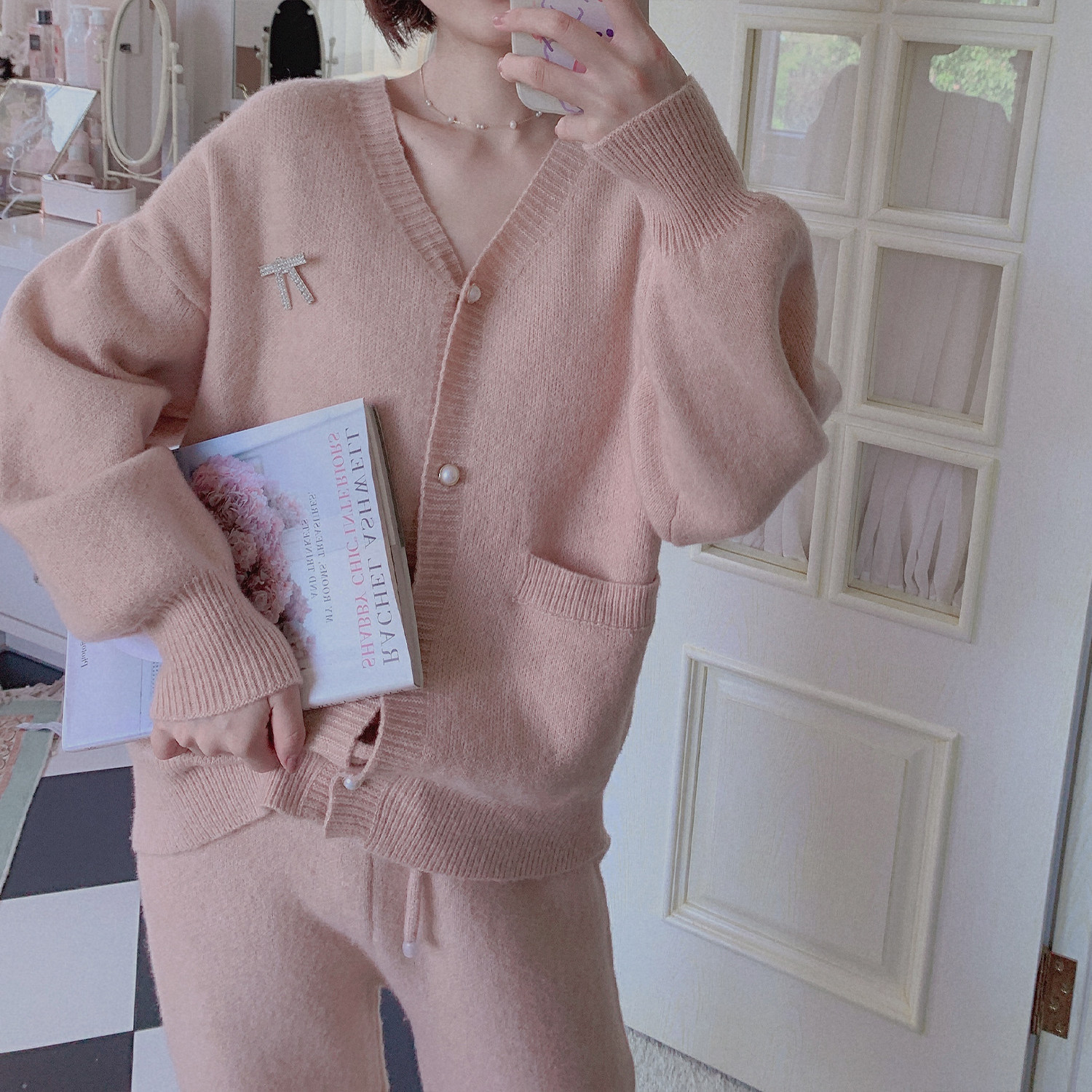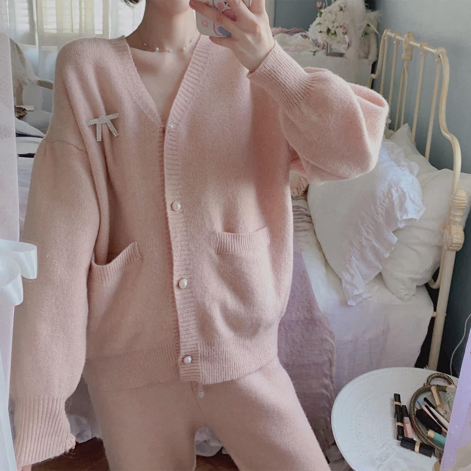 Peach honey can be outworn with small balsamic wind princess sleeves elegant pure color knit pyjamas woman autumn and winter style cardiovert clothes