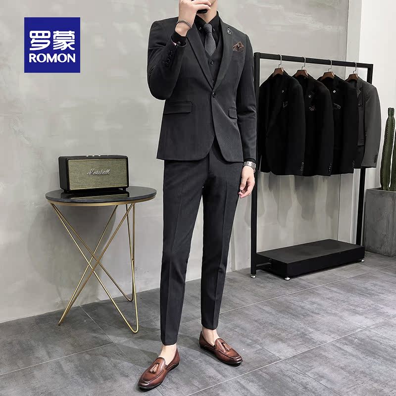 Romon solid color suit suit men's fashion British slim fit large size casual gray suit three-piece groom wedding