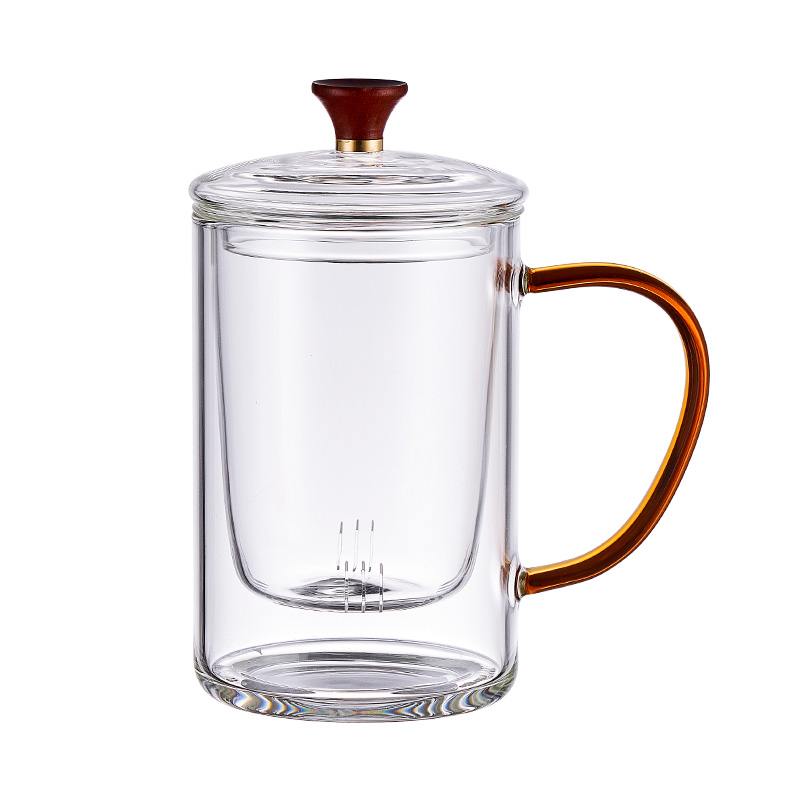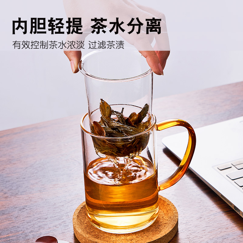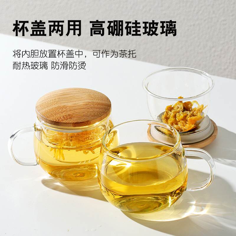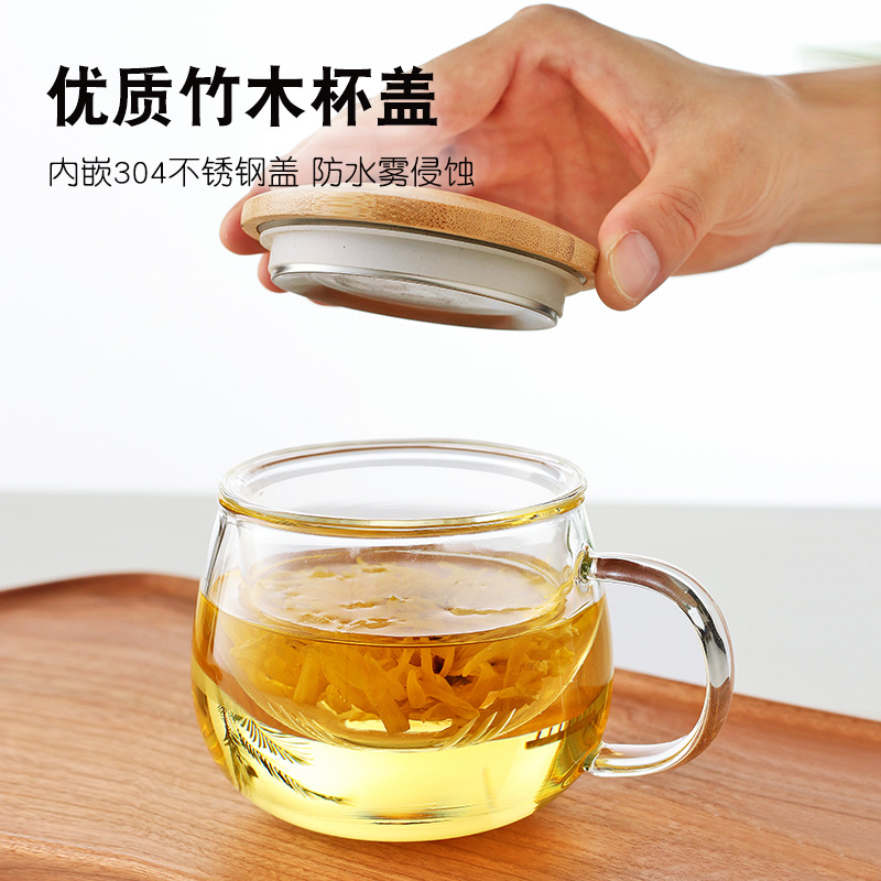 Heat-resistant glass teacup household office tea water separation bamboo wood cover with handle flower teacup filter tea cup