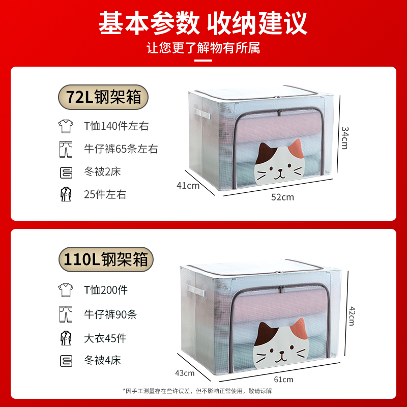 72L (52 * 41*34cm) large capacity transparent visual double door plus coarse steel frame 110L (61 *43 * 42cm) large capacity transparent visible double door