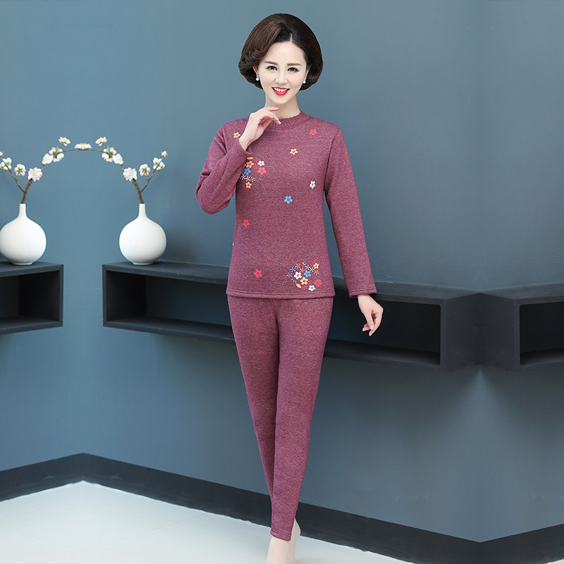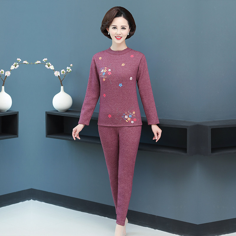 Middle aged warm autumn clothes suit women's moms autumn and winter clothes add suede and thicken two sets of grandma cold-resistant undershirt