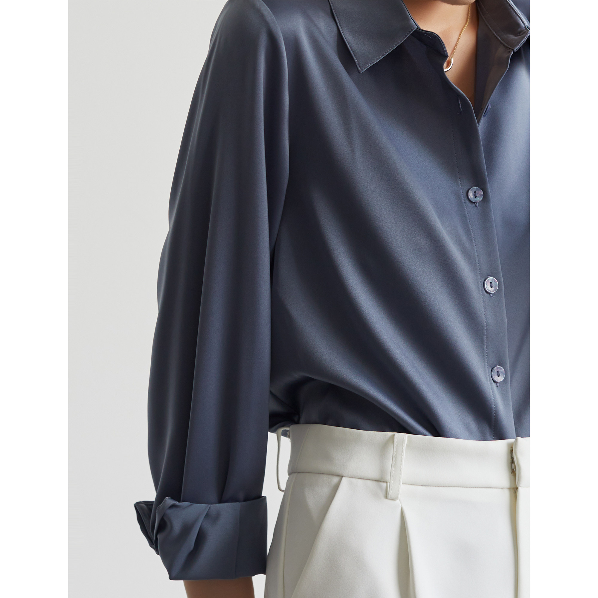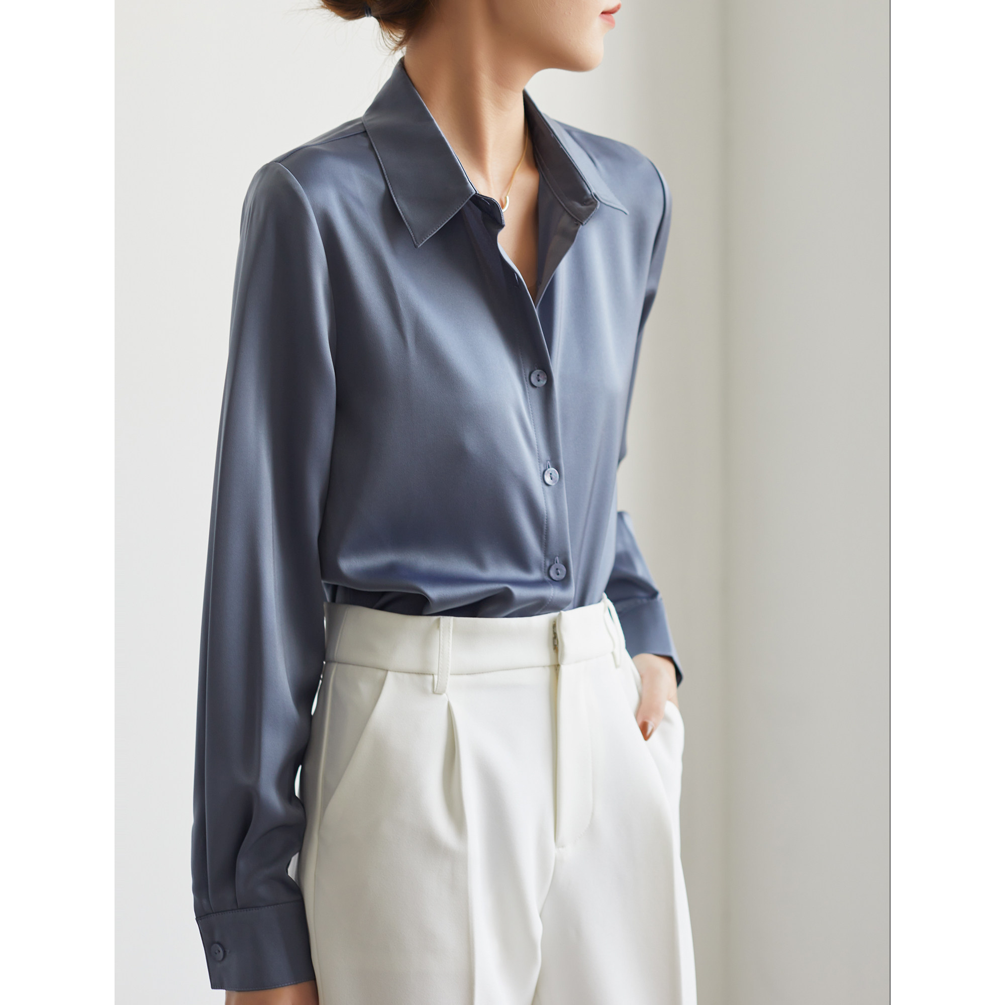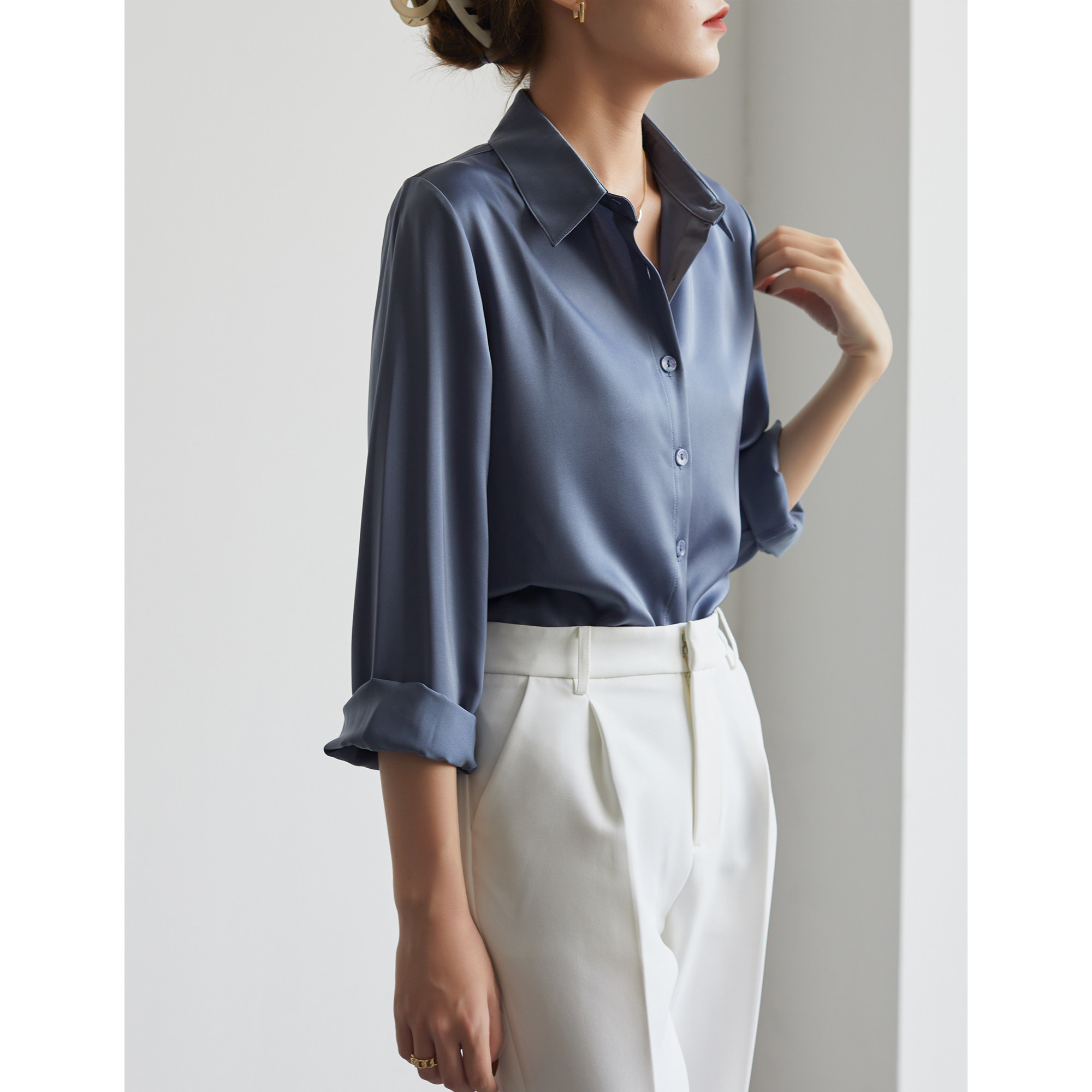 S AUTUMN gray-blue straight satin basic stand collar long-sleeved shirt women's professional commuting loose shirt autumn