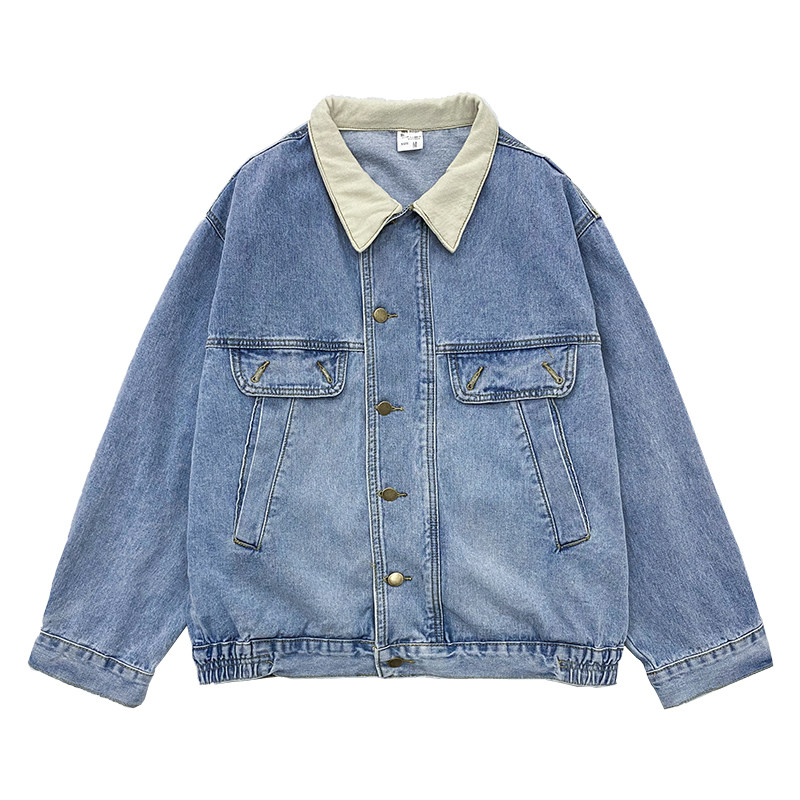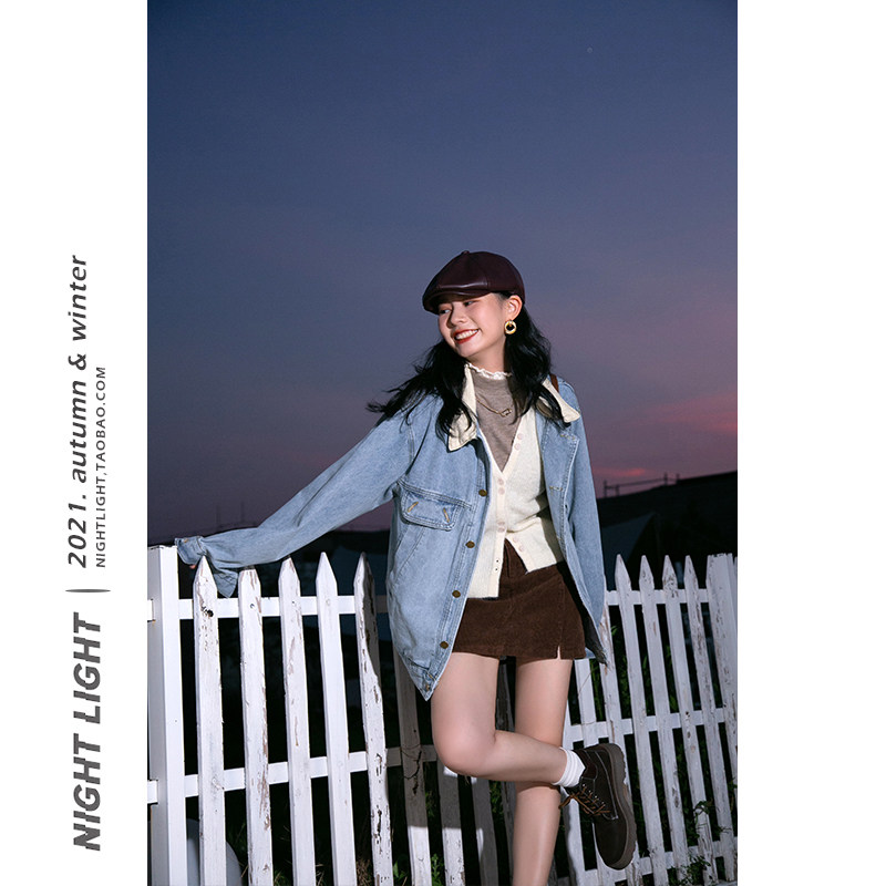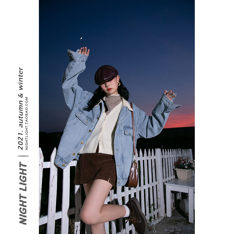 Night Light Retro Texture Light Blue Collar Denim Jacket Woman Loose Casual 100 Hitch 2021 Winter New Jacket