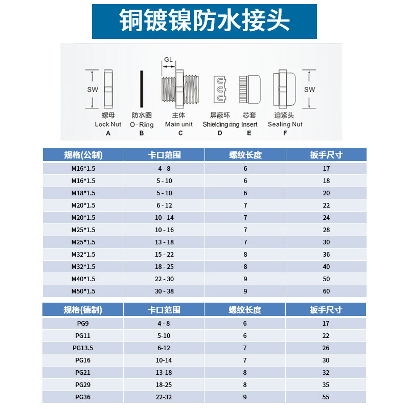 JG metal waterproof connector fixed sealing cable Glen head brass nickel-plated locking Glan head M12M16M18