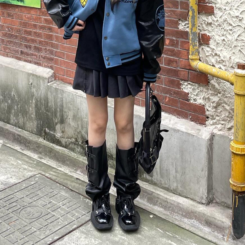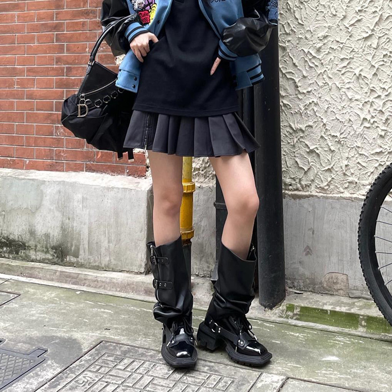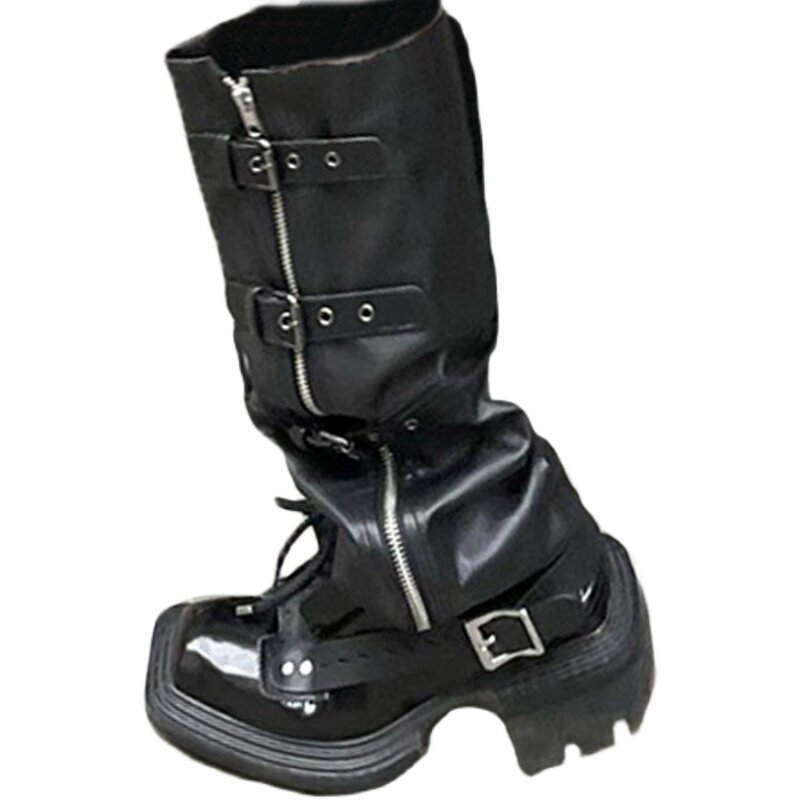 Punk Fried Street Riding Boots Woman 2021 Fall new square head coarse heel 100 lap-side pull chain though paint boots child