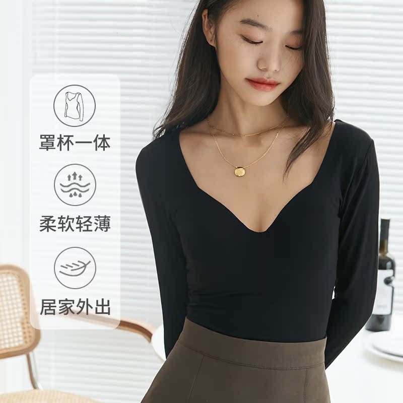 Autumn and winter V-neck thermal underwear women plus velvet thick inner long-sleeved bottoming shirt without bra black slim-fitting autumn clothes