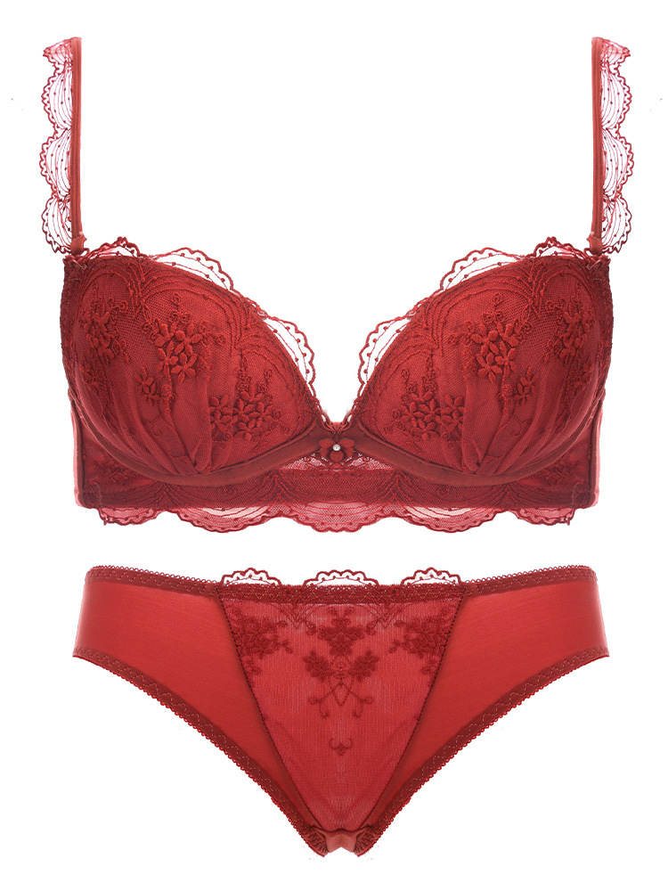 Benming year red latex lace underwear female small chest gathered no steel ring upper support sexy wedding bra set