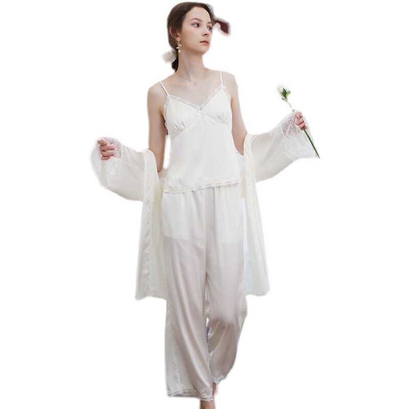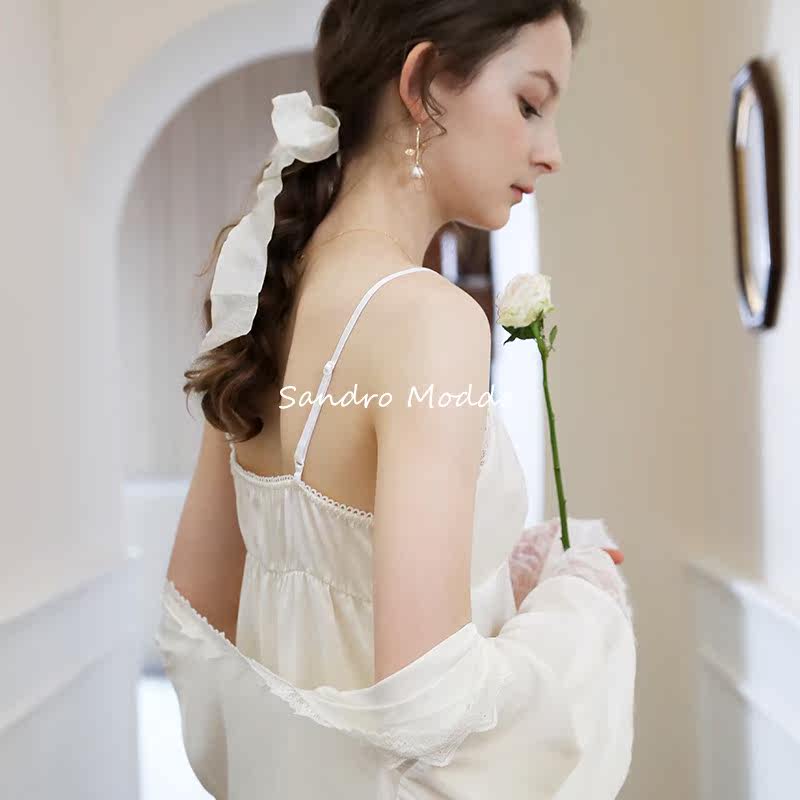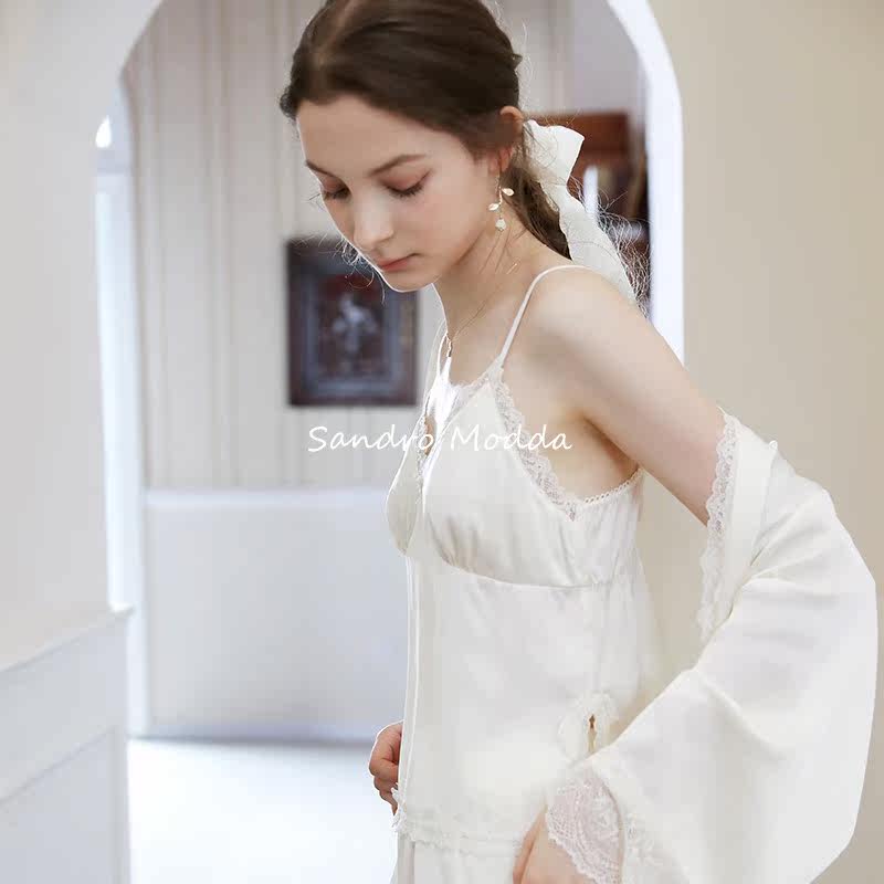 Sandro Modda French pajamas three-piece suit women's spring and autumn silk strap chest pad sexy lace homewear