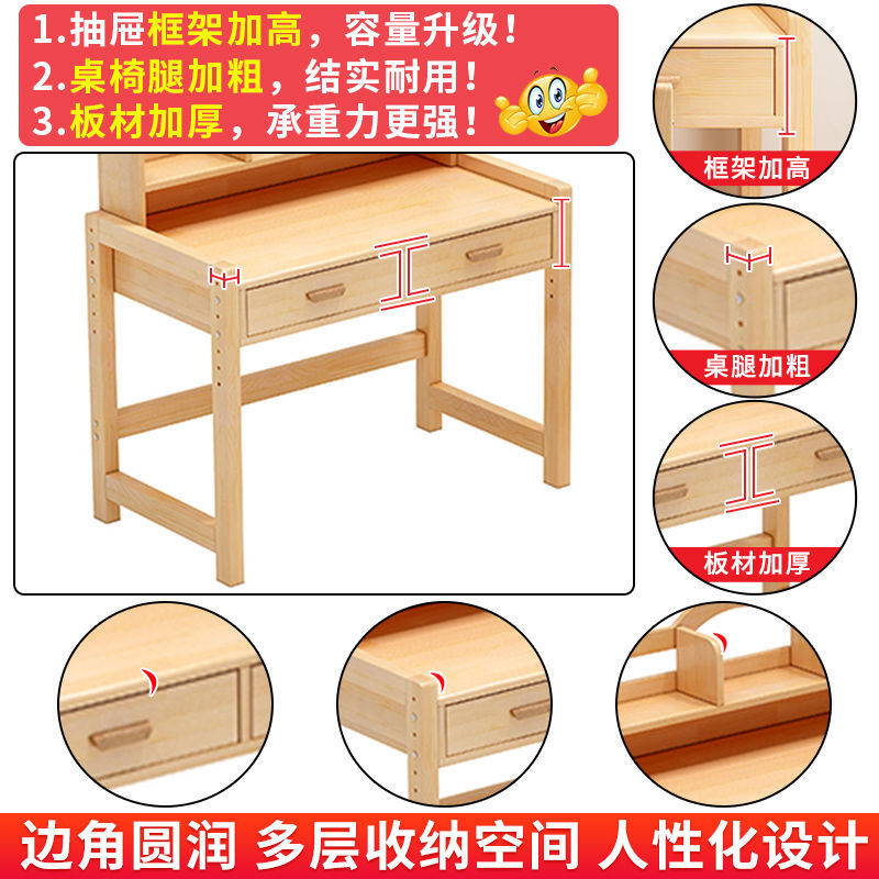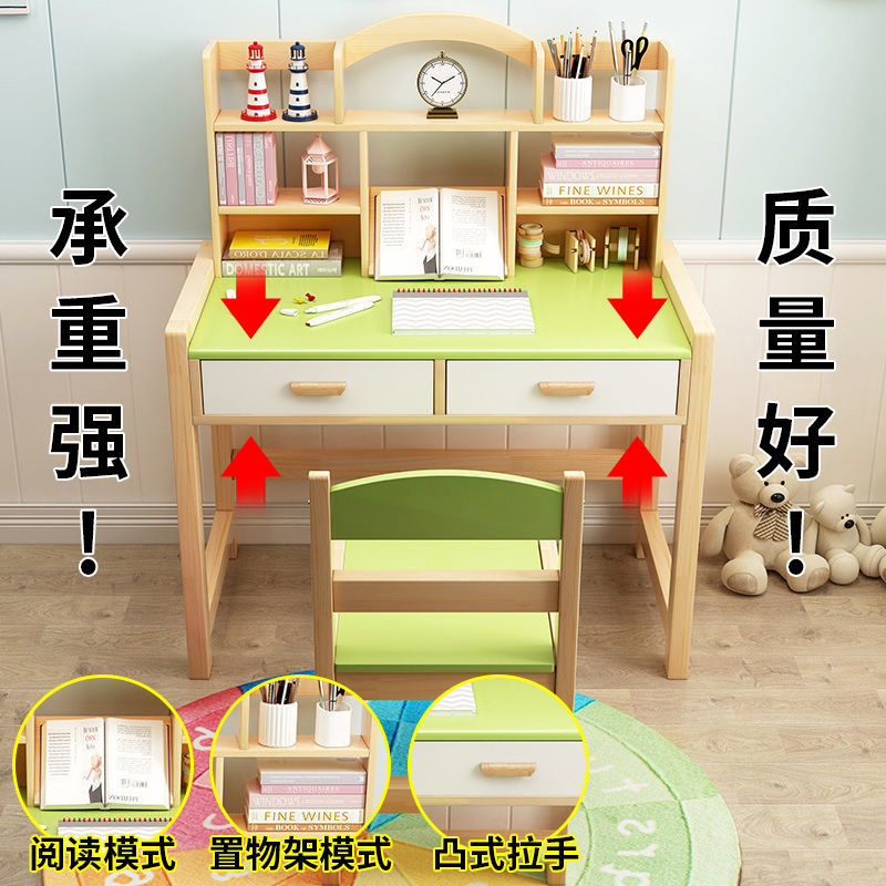 Solid wood liftable children study desk book table and chairs kit for elementary school students home minimalist class table and chairs desk bookshelves