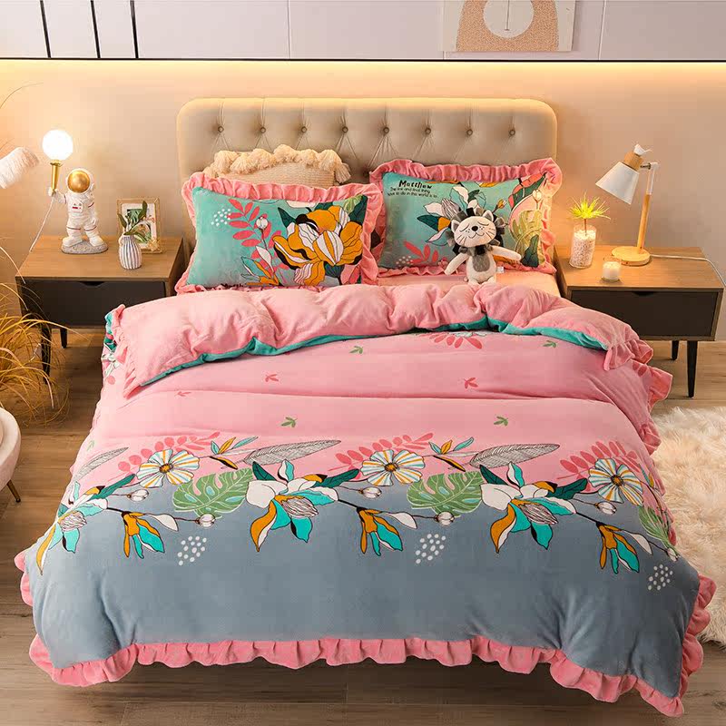 Coral fleece plus fleece thickened crystal flange fluff quilt cover four-piece set winter high-grade milk fleece quilt cover