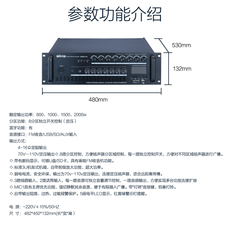 Public broadcast 800-2000W sound column wall-mounted suction top horn sound FM Bluetooth USB constant pressure power amplifier 8 partitions