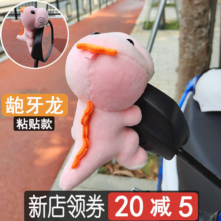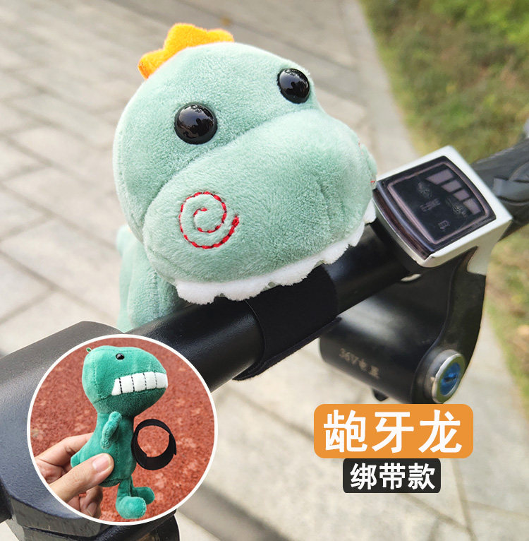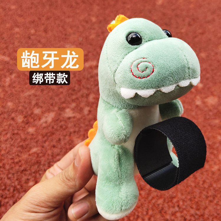 Green with the same buck-toothed dinosaur keychain, blue with the same buck-toothed dinosaur keychain, pink, with the same buck-toothed dinosaur keychain, dark green, with the same buck-toothed dinosaur keychain