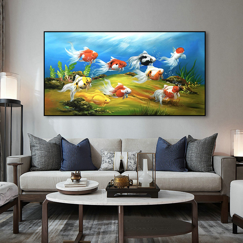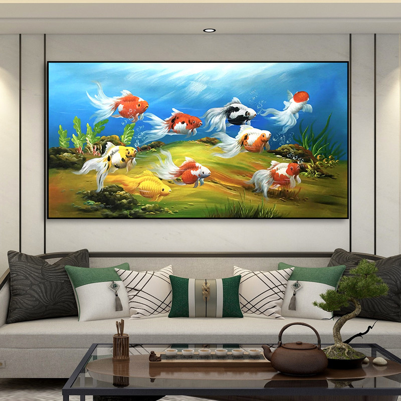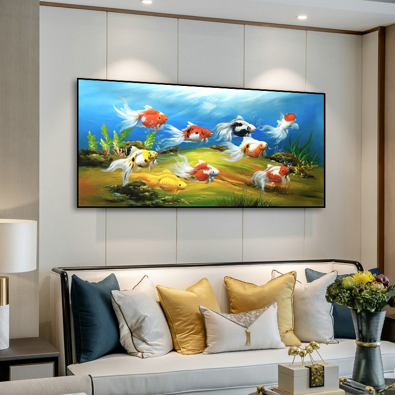 Nine fish picture hand-painted oil painting new Chinese style hanging painting living room decorative painting study tea room simple beauty mural ocean goldfish painting