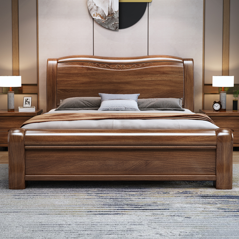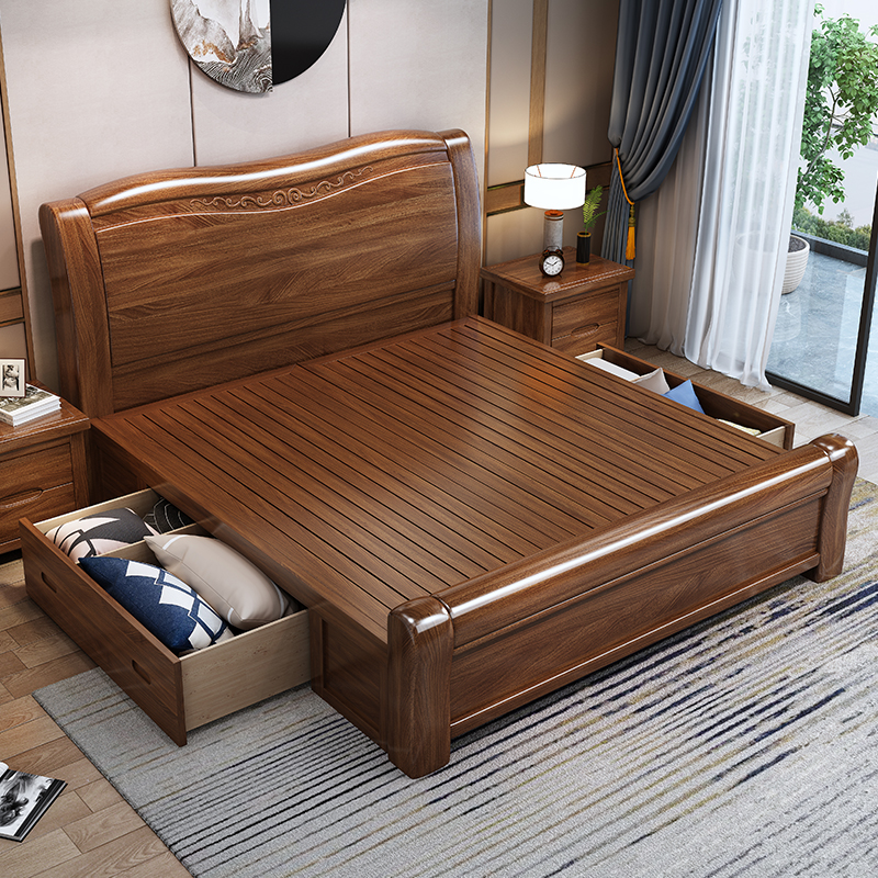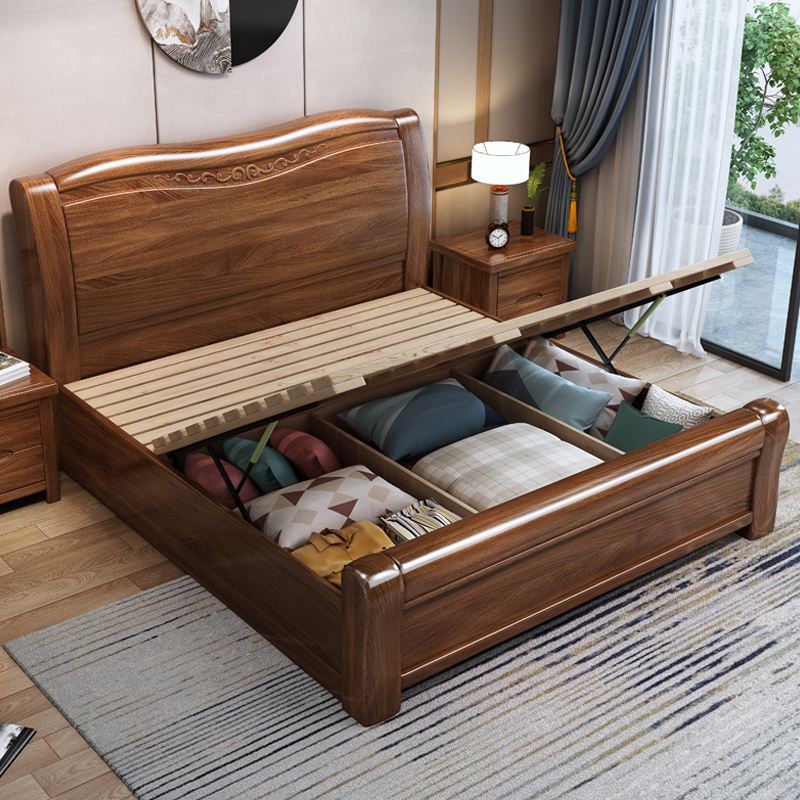 Walnut solid wood bed 1 8 meters Chinese style double bed modern minimalist master bedroom light luxury storage wedding bed 2022 new